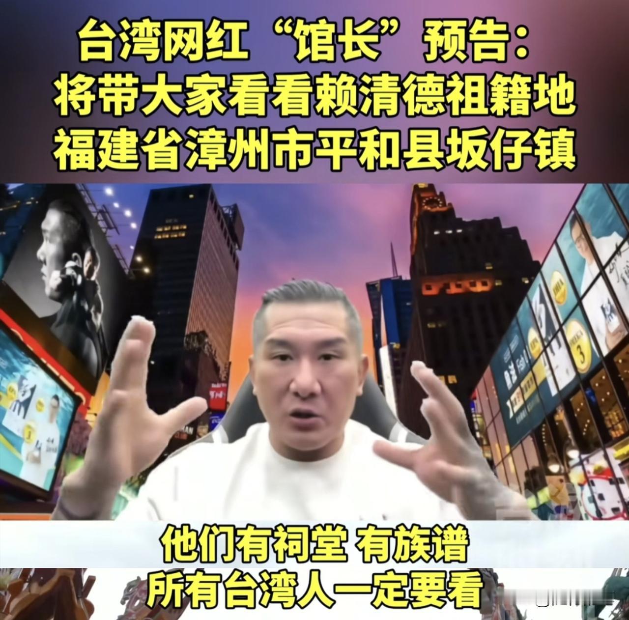 期待!馆长透露来大陆其中一个行程居然是要帮赖清德寻根。 根据馆长透露届时还会进行直播,直播题目都想好了,直接叫“赖清德寻根”。馆长要让台湾人知道赖清德和民进党这些人都是中国人,都有族谱可以查证。 而且赖清德的祖籍所在地早已经有人查证过了,不用馆长花费多少时间就可以找到,馆长的作用就是要让赖清德的身份祖籍消息在岛内引起高度关注即可。 馆长这招真的太妙了,太有意思了,帮赖清德寻根,把赖清德的祖籍查的清清楚楚,通过馆长的渠道平台在岛公布出来,借由馆长的热度引起台湾更多人关注,戳破赖清德的“台独”谎言,让岛内绿营人士看清楚赖清德是中国人的祖籍身份。