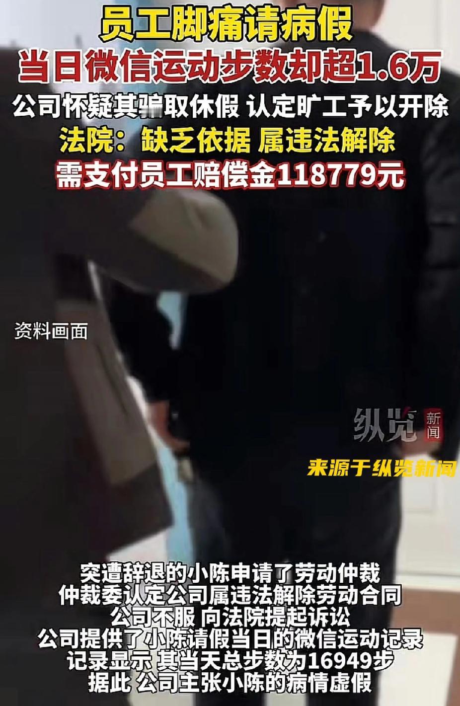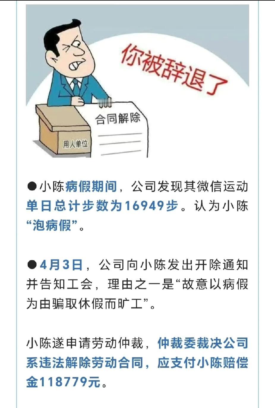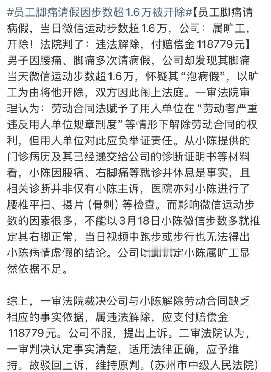 步数超1.6万就被开除,这公司的“逻辑”太离谱! 最近,“员工脚痛请假因步数超1.6万被开除”的新闻引发了广泛关注。男子小陈因腰痛、脚痛多次请病假,却被公司以脚痛当天微信运动步数超1.6万为由,怀疑“泡病假”,以旷工之名将其开除。这操作,真是让人惊掉下巴! 公司的逻辑似乎是:你脚痛还走这么多步,肯定是装病。可问题是,影响微信运动步数的因素多了去了,谁能保证走了1.6万步就代表脚没问题呢?也许是不得已的活动,也许是步数统计有误。 一审法院的判决可谓是明察秋毫。从门诊病历和诊断证明书等材料能看出,小陈就诊休息是事实,医院还进行了相关检查,并非他随口一说。公司仅凭步数多就认定旷工,依据明显不足。 公司不服上诉,结果二审法院也维持原判,明确指出一审判决认定事实清楚,适用法律正确。最终,公司因违法解除劳动合同,要支付赔偿金118779元。 这起案件给那些随意开除员工的公司敲响了警钟。用人单位在解除劳动合同时,必须有充分的事实依据,不能仅凭主观臆断就做出决定。员工请病假,应该以医院的诊断和证明为准,而不是用一些不靠谱的理由去质疑。 对于广大劳动者来说,这也是一个有力的支持。当我们的合法权益受到侵害时,要敢于拿起法律武器,维护自己的权益。毕竟,法律是公正的,不会让劳动者的权益被随意践踏!