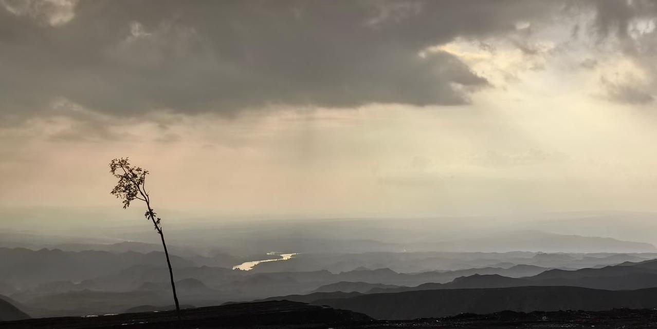 孑孑小树立黄昏,扑面冷雨盖头云。 脚下贫脊根基浅,心头澎湃执念深。 不羡南国松柏枝,喜看北疆胡杨林。 层峦叠嶂留不住,日落西山水流东。