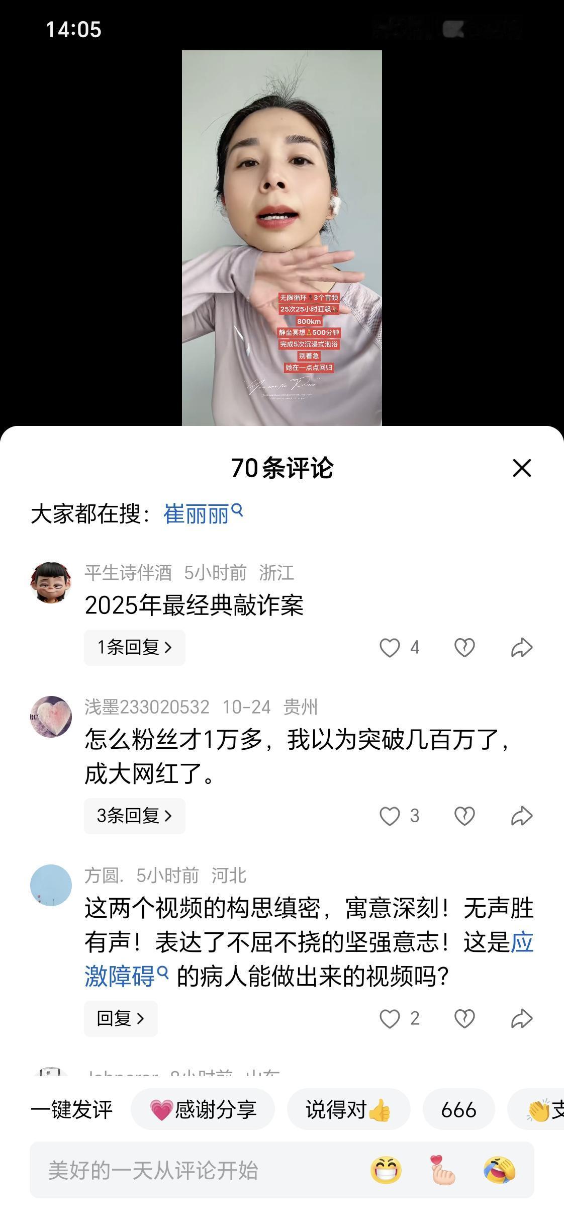 丽丽的战争,丽丽的2000万加法办把她推上风头浪尖。之前丽丽怼网友逗闷子,被网友骂惨了,现在丽丽换了一种打法。 用什么拯救丽丽? 丽丽在自救。 丽丽告诉你, 用丽丽的擦掉汗水, 用丽丽听的音乐, 用丽丽狂飙的公里, 用丽丽的静坐冥想, 用丽丽的美颜与鼻孔, 还要用丽丽的美颜, 现在丽丽还用不出现本人声音的视频。 丽丽知道大部分人都要吐槽她, 丽丽知道每个人都不会高看她一眼, 丽丽知道大家的质疑, 但丽丽还得活着, 她想到日出日落,还得发视频。 做网红有什么不好? 做网红太好了。丽丽就要做网红,黑红也是红,红了就可以了。 请大家锁住丽丽!锁住丽丽的战争,看丽丽的回归与变化。 丽丽才不怕评论区[笑哭][笑哭]! 丽丽太想当流量网红了! 崔丽丽 丽丽的战争 崔丽丽强奸案