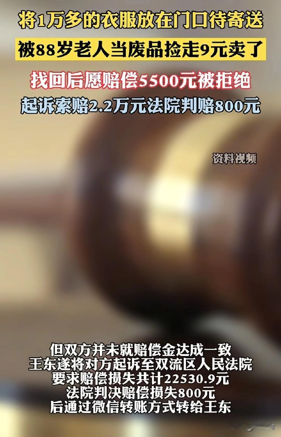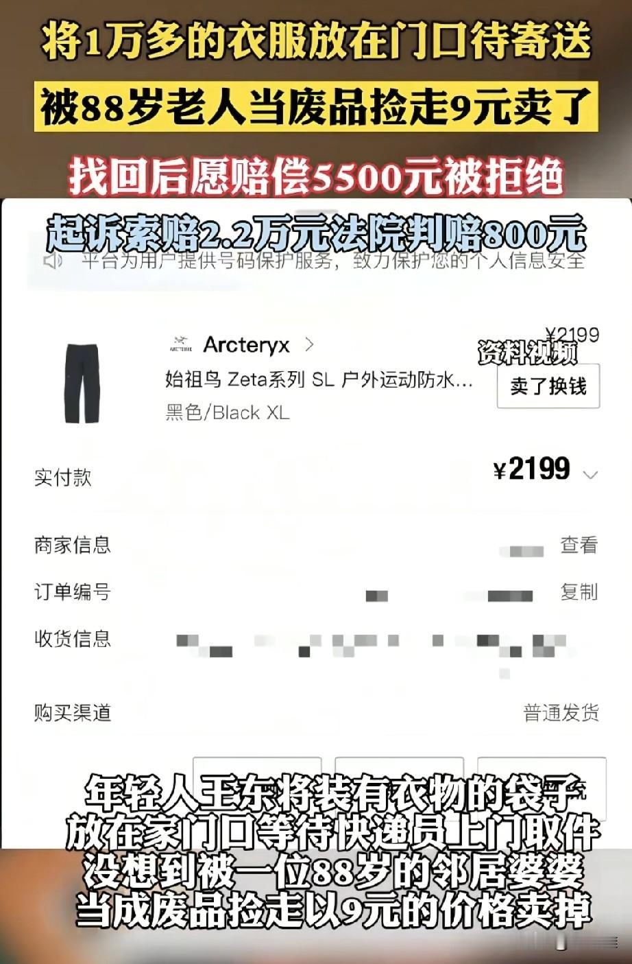 男子将价值万元的衣服放在家门口等待快递取去保养,邻居婆婆路过门口,以为是破烂捡走,以9块钱的价格卖给废品站。男子发现后要求婆婆赔偿8000元,婆婆家人只愿赔5000块钱,双方没有达成一致,男子将婆婆告上法庭! 深秋的成都,天气已带了些许凉意。王东像往常一样,将一个大纸袋放在家门口,里面是他准备寄回品牌方保养的几件高档户外服装。 他看了眼手机,快递员预计还有十分钟到达,于是将纸袋放置门口,自己回屋上了趟厕所。 就在这时小区里88岁的张婆婆正蹒跚经过。 在老人眼里,这个放在公共楼道旁的鼓囊囊纸袋,与其它被丢弃的破烂没有啥两样,于是费力的弯腰捡起,一步步挪向了小区门口那家废品回收点。 经过一番挑拣和讨价还价,袋中物品最终以九元钱的价格成交。 当王东再次出门时,发现门口的袋子不翼而飞。一番焦急的寻找与询问无果后,他调取了监控录像。 画面清晰地记录下了张婆婆拿走袋子的全过程。 报警后,警方很快联系到了张婆婆的家人。得知误卖了邻居的重要物品,张婆婆和儿媳李芳也深感不安,她们立刻赶往回收站,几经周折,终于将被卖掉的衣物追回。 然而,当这些衣物重新回到王东手中时,他的心凉了半截。 原本硬挺的GORE-TEX面料上沾染了油渍,裤脚被勾出了细小的线头,金属配件上也满是划痕。 “这些衣服都有不同程度的受损,没法再穿了。”王东心痛地说。 他提出让对方赔偿8000元,这个数字让李芳愣住了。 她看着这些有明显穿着痕迹的旧衣服,实在无法将它们与如此高昂的价格联系起来。 本着解决问题的态度,李芳犹豫地提出了赔偿5500元的方案,但被王东一口回绝,协商陷入了僵局。 “我并不是要为难一位老人,但这些衣物的价值确实很高,我不能平白承受这个损失。”无奈之下,王东一纸诉状将张婆婆告上了成都市双流区人民法院,要求赔偿财物损失、精神损害抚慰金等共计22530.9元。 法庭上,双方各执一词,王东向法庭出示了当初的购买记录和发票,证明这些衣物原价确实超过万元。 而张婆婆的代理人则强调,老人年事已高,辨识能力有限,其行为属于重大误解,且事发后家人积极找回衣物,态度诚恳,王东将贵重物品置于公共场所,自身也存在保管不当的过失。 法官仔细看着这些作为证物的衣物,它们虽然是高端品牌,但确实也被穿了好长一段时间。 经过细致的审理,法院最终认为,张婆婆因过错侵犯了王东的财产权,应当承担赔偿责任。 但赔偿金额的确定,不能仅依据购买时的原价,必须综合考虑衣物的购买时间、实际使用情况、折旧以及受损程度等因素。最终,法院酌情判决张婆婆赔偿王东财物损失800元。 收到判决书后,李芳于9月26日通过微信将800元转给了王东。 我觉得我们既要学会保护自己的权益,又要学会尊重那些认知错误,邻里之间的沟通与理解远比那些赔偿更珍贵!
