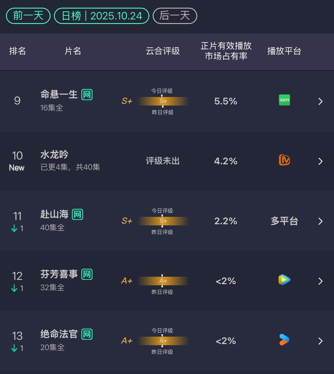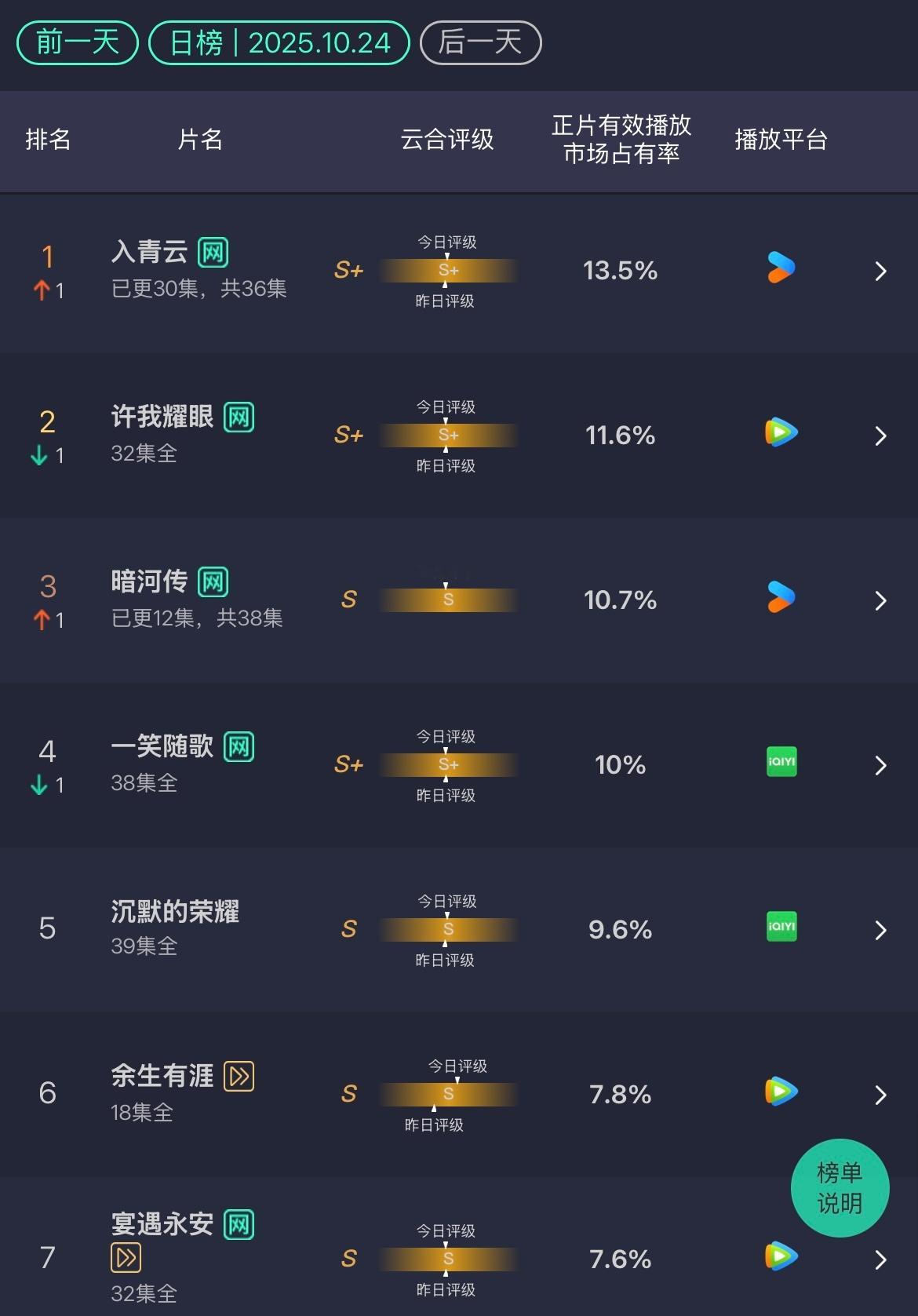 10.24 云合入青云:13.5% 首次第一暗河传:10.7%水龙吟:4.2%首