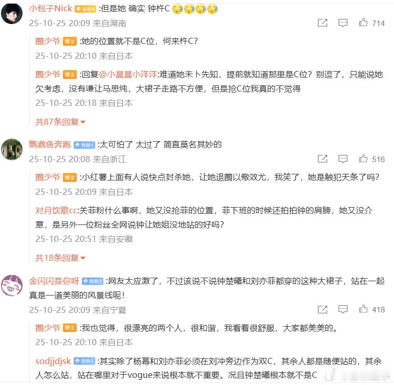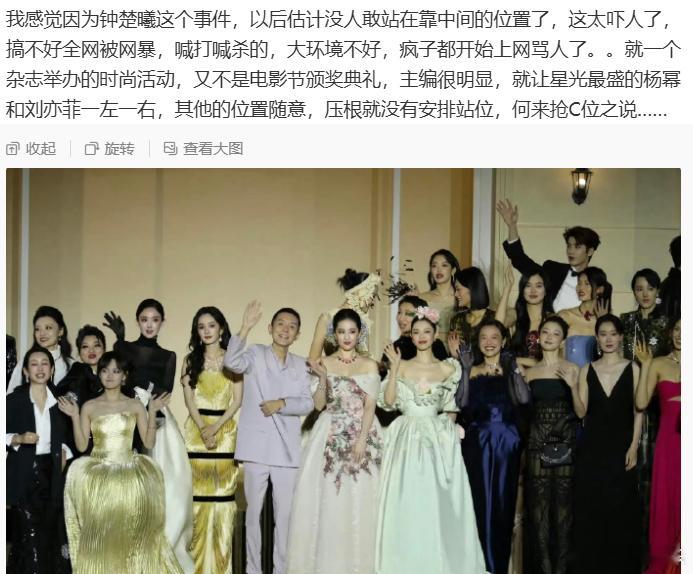 在VOGUE盛典当晚,红毯秀明星云集,各有千秋,钟楚曦和迪丽热巴李沁等诸多女星一样,没有特别出彩,也没出丑,存在感不强,加上她不是流量明星,也没啥粉丝和营销。但就是在合影站位环节,钟楚曦站位居中,但不知道是刻意还是无意,一直没挪动,忙着自嗨以及与其他女星互动聊天,以至于刘亦菲刘冲杨幂站位受限,从而被吐槽质疑。