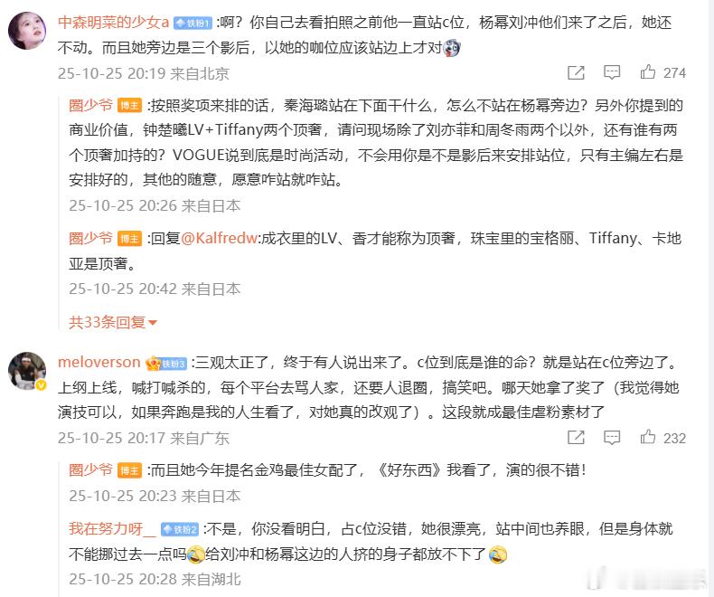 这就是个普通的活动,谁第一个出场谁压轴谁站C位,真的那么重要吗,不点美貌人气也不代表身价和荣誉,粉丝们何必这么在乎这些虚头巴脑的事。有人质疑,钟楚曦没拿过影后,站位却比影后周冬雨马思纯张小斐好。那如果这样说的话,刘亦菲杨幂也没拿过重量级影后,站位也不应该居中,为什么这两位就没人吐槽质疑,谁做的规定。如果不是专业权威奖项,不讲究站位,那谁都可以乱站,没必要拿奖项说事。