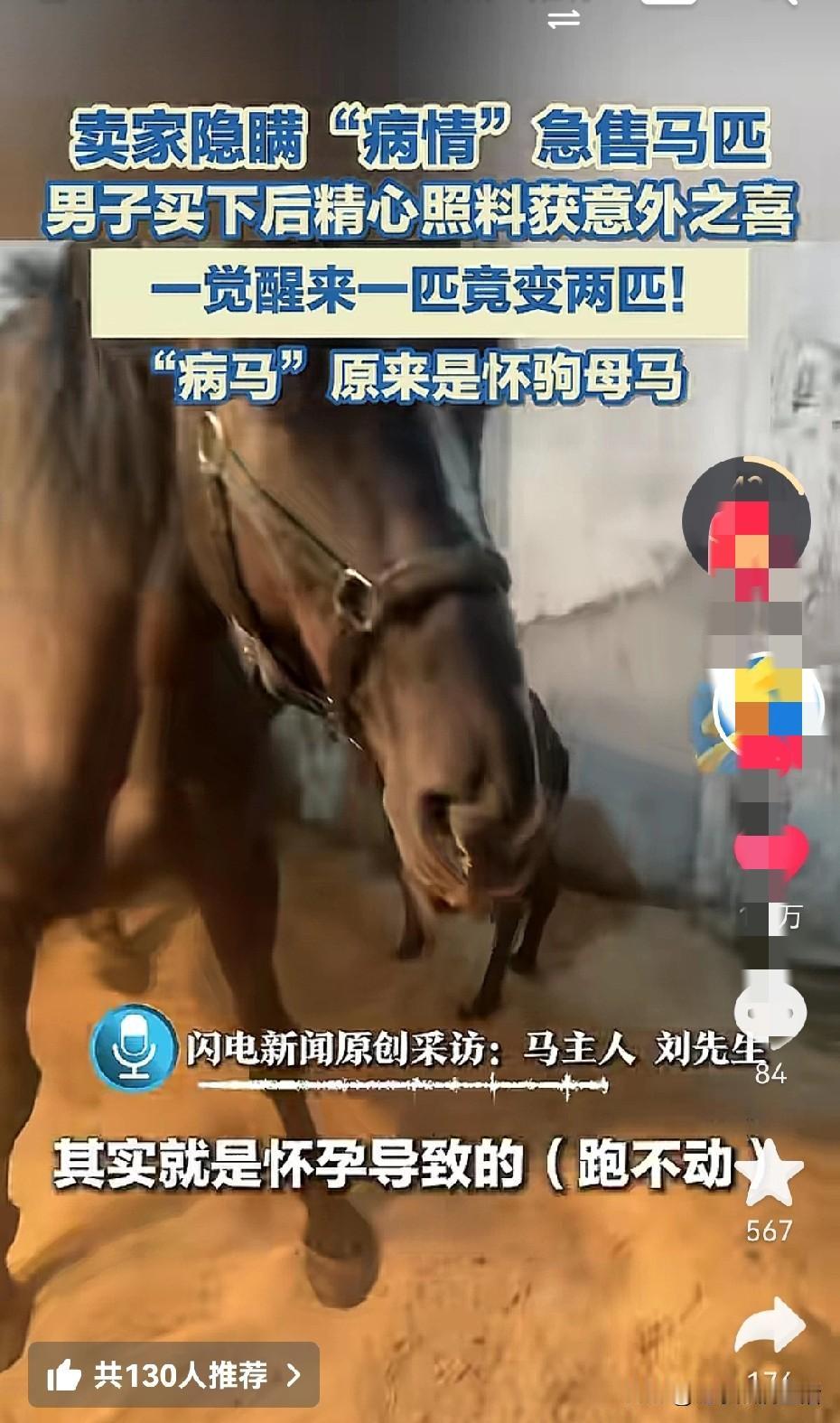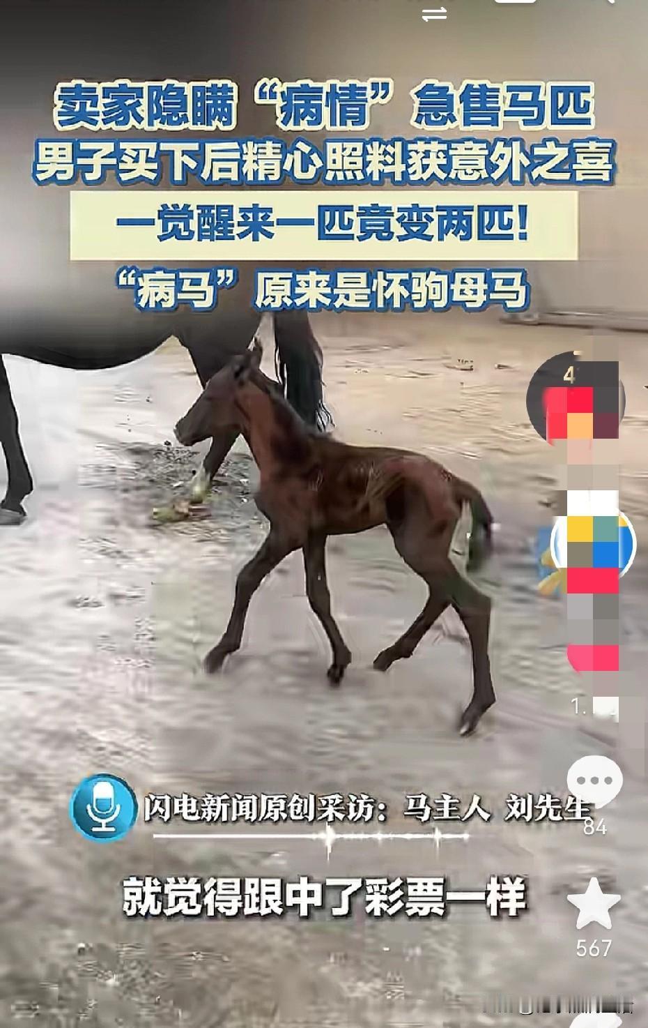人还是要心存善念啊! 卖马的人,这会大腿都该拍肿了吧。 前一秒还在窃喜自己终于把“病马”忽悠别人买走了,下一秒会不会后悔自己有眼不识孕马,自己来了一波买大送小呢? 山东淄博的这位大哥,至今还感觉自己好像中了彩票一样,自己朋友马场里有一匹马,走不动道,还非常消瘦,也没有告诉他可能是一匹“病马”,他只是觉得这马太可怜了,就买下来了。 刚开始的时候,自己没有条件去饲养这个突然多出来的大家伙,只能继续寄养在朋友的马场里,自己偶尔抽空看看。 后来自己觉得不方便照顾马儿,看着日渐消瘦的爱马,朋友也不能很好的照顾,自己就狠下心来建了一个小型马棚。 每天精心的照顾着它,好吃好喝的供着,很快这匹爱马就给了他一个大大的惊喜,就在他打开马棚的瞬间,居然多出来一个小马驹。 原来这匹马不是生病,而是怀孕了啊。 至于什么时候怀孕的,怎么怀孕的,它的原主人都是一问三不知,看来也是养的不上心啊,马儿跟着他,也享受不了几天好日子。 或许养的人真不知道怀孕了,自己平时也没上心。记得我邻居家某一年过年要还愿,托人去大集上帮她买一只母羊,羊牵回来总觉着肚子不对劲,摸着和我家狗有崽了一样那种有跳动的感觉,提出和隔壁一个爷爷家的羊换一换,他不愿意,非说他的羊肥,换了就亏大了。最后还是宰了这母羊,肚子里是两坨大致能看出雏形的羊羔,他们都说双胎羊羔挺少的,那个爷爷后悔的哟。 所以人在任何时候,都要心存善念,善良的人,运气不会太差!