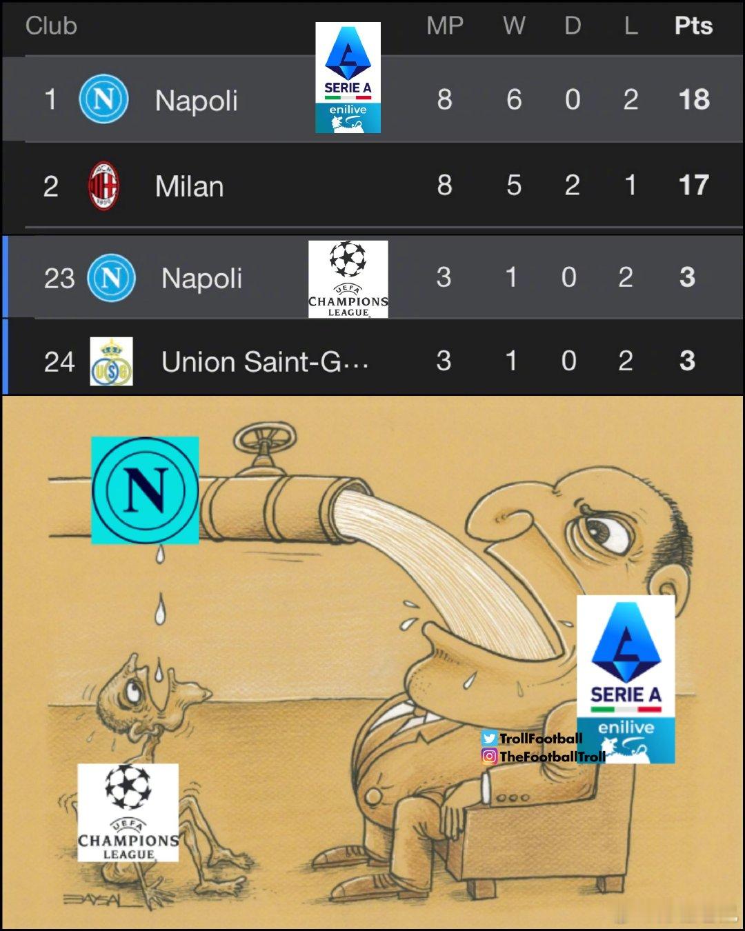 【那不勒斯3比1国米,登顶意甲!】而上一场他们在欧冠客场2比6大比分不敌埃因霍温,创造了队史欧战最大比分输球纪录!