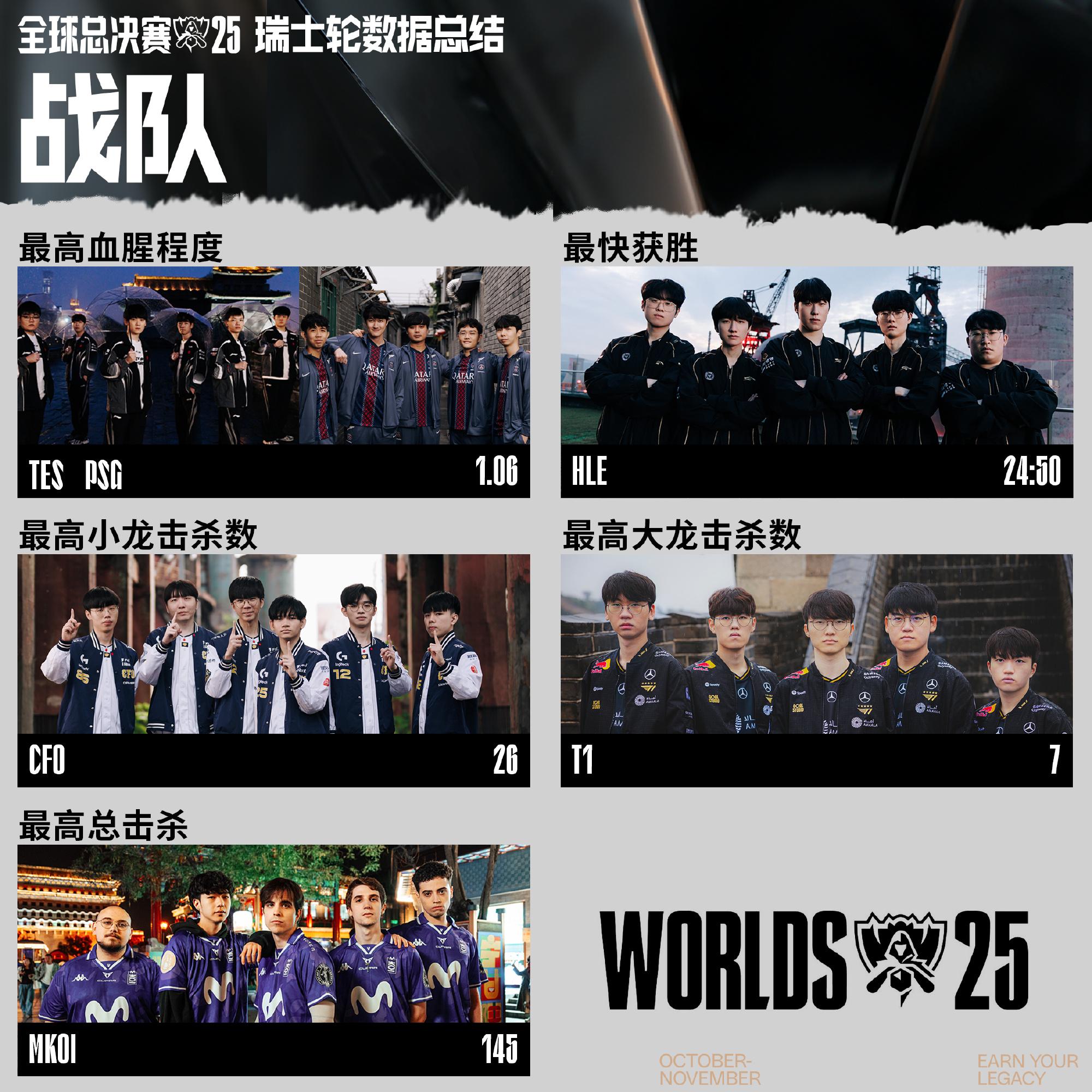 虎扑10月26日讯今日英雄联盟赛事数据发布2025全球总决赛瑞士轮阶段数据总结,具体如下: