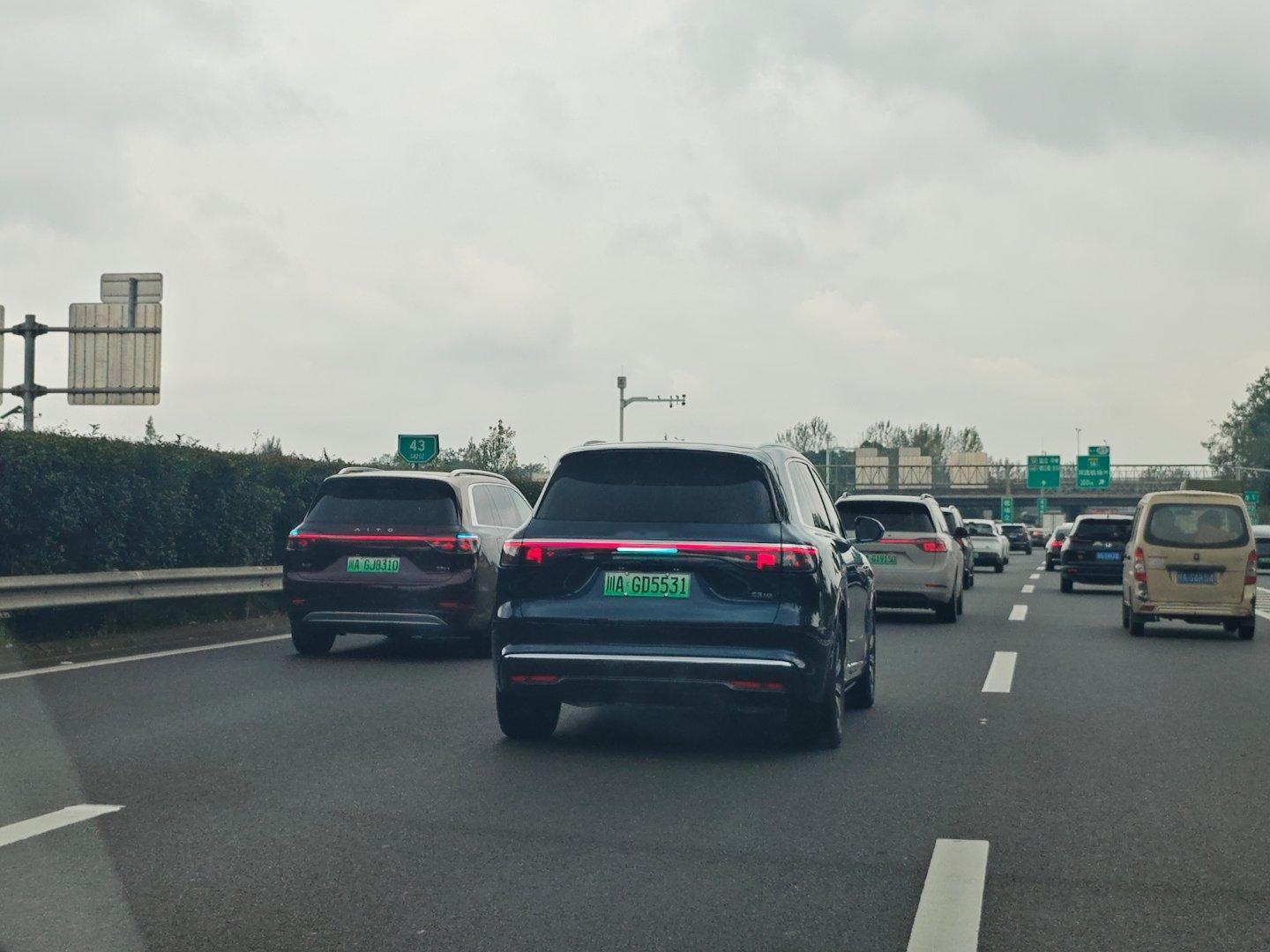 三辆问界,M8和M9都亮着智驾小蓝灯,最前面那辆老款M9我猜也开着的。当然我的智