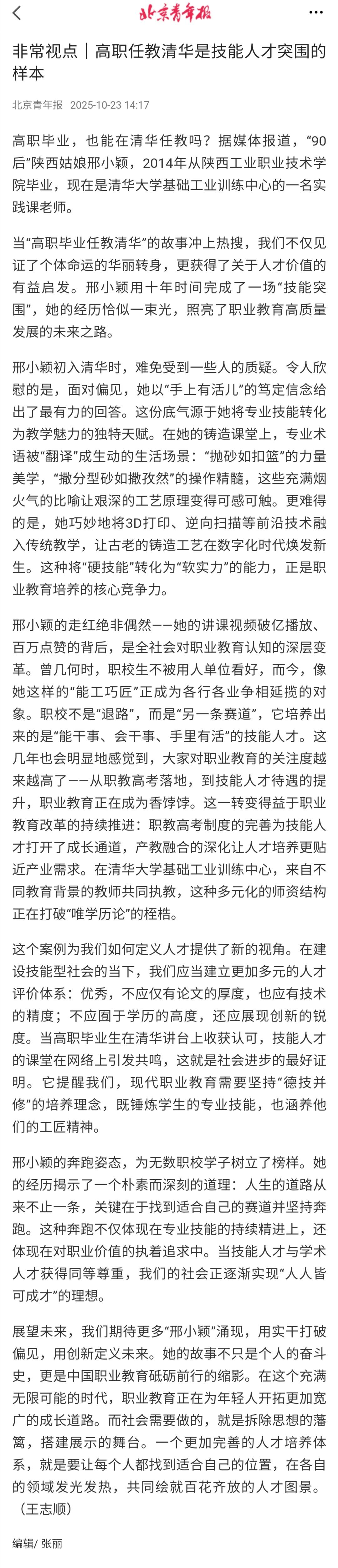高职毕业生任职清华,都引起舆论关注,只能说明一点,很多人对社会、行业、职业太缺乏了解了。清华大学难道只有教学、科研岗?没有后勤、基建、实验室、实训中心、保安、保洁?一直以来,大学的后勤、基建、实训中心,都会招聘一些高职大专生(以前还招中专技校生)。这根本不是高职大专生的“逆袭”,而是属于正常的双向选择。同样,到医院、科研院所工作,也不都是医生、研究员,还有财务、后勤、技术等工作岗位。