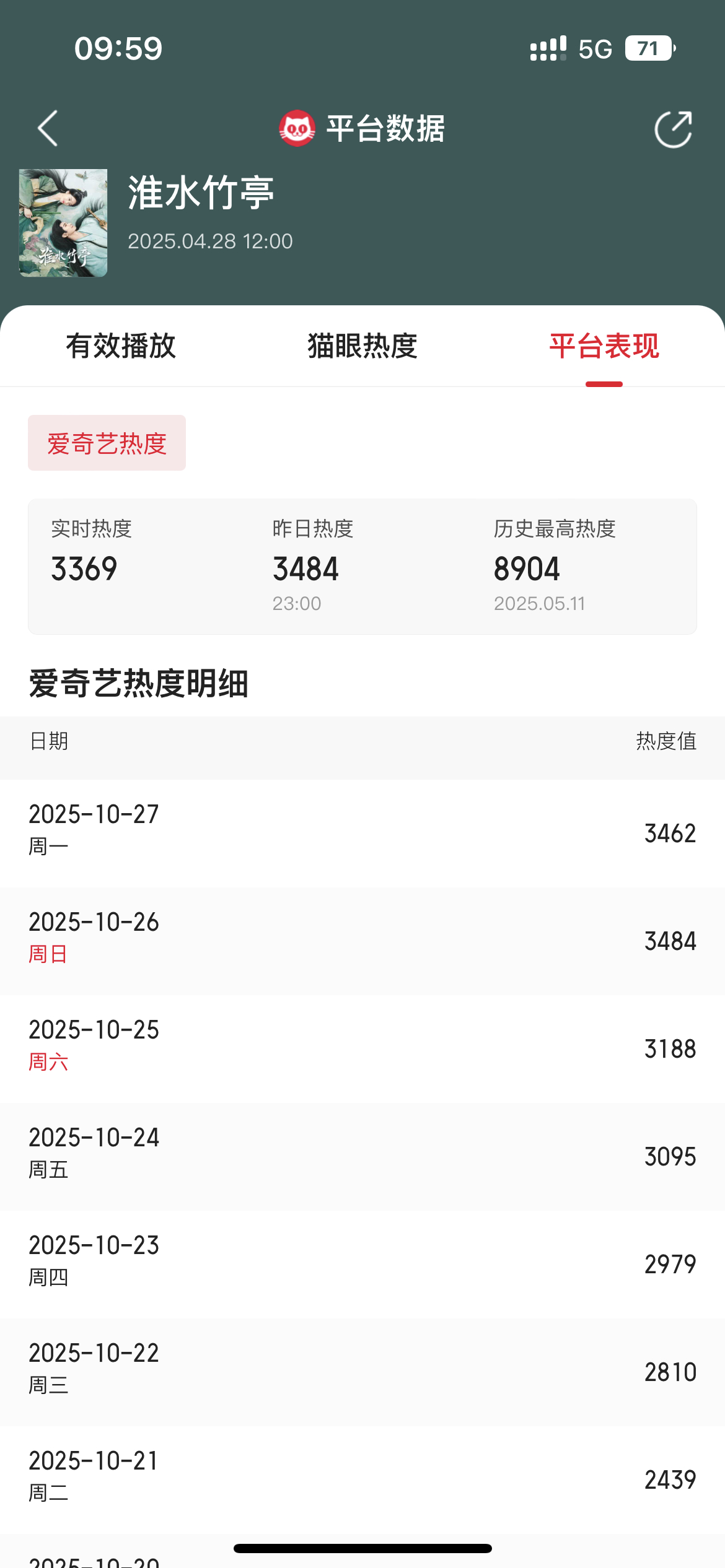 最近几天因为刘诗诗演技好,以及限免3天,飙升榜top2,热度2400涨到3484,涨幅1000➕,大涨[耶]