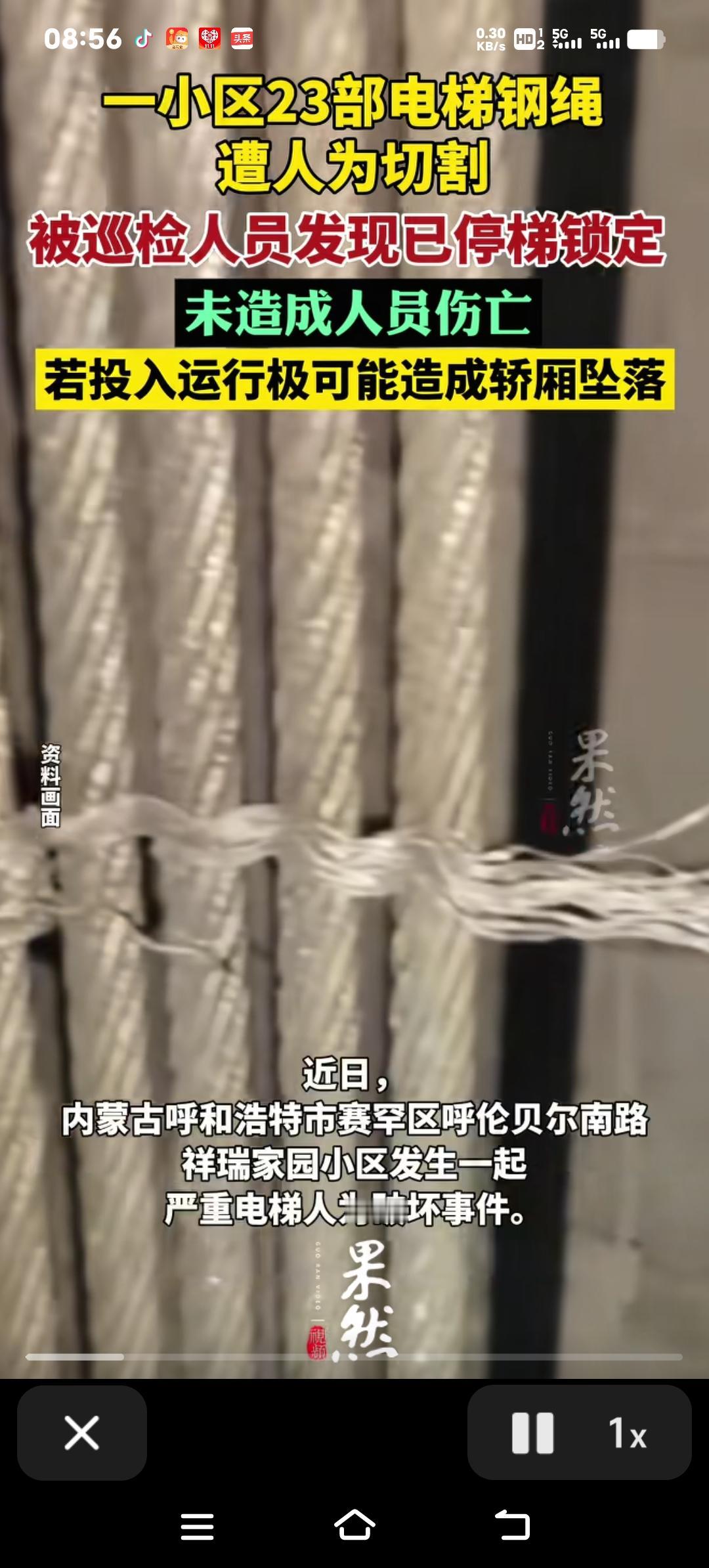 惊呆了!呼和浩特小区000部电梯钢绳被割,000岁男女被刑拘,差一点出人命! 深夜溜进电梯机房切断钢绳,这种行为简直让人心惊胆战!呼和浩特祥瑞家园小区里,整整23部电梯都被人恶意搞破坏,钢绳被割断了将近三分之一,光是想想就后背发凉。还好检修人员特别细心,第一时间发现问题并报警,这才阻止了可能发生的电梯坠落悲剧,真是不幸中的万幸! 警方动作超快,不到一天就把嫌疑人逮住了,破案效率没得说,必须狠狠夸一波!这种拿公共安全开玩笑的行为,绝不能轻饶。电梯安全关系到每家每户,这次的事也给所有人提了个醒:日常维护和机房管理真的半点马虎不得。 大家一起来聊聊,你们觉得物业该怎么做,才能彻底堵住这类安全漏洞?欢迎在评论区留下你的建议!