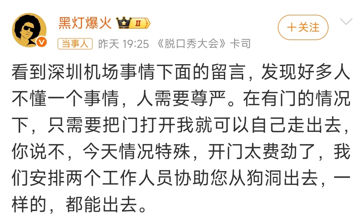 盲人脱口秀演员谈深圳机场被吐槽大家坐飞机都是从这个门进去,怎么残疾人从这个门进去就成了“狗洞”?感觉有的残疾人一边说希望大家把他们当正常人对待,一边又敏感的不得了。