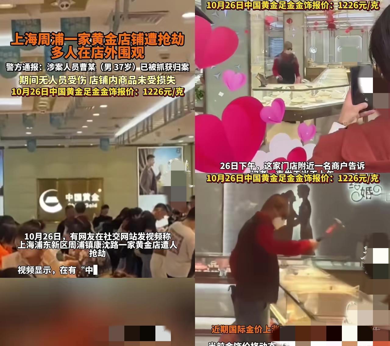 上海这起金店抢劫案,看完我心里堵得慌! 10月26号上午周浦那家中国黄金店,37岁的曹某砸了柜台,右手拿着东西砸,左手提个空袋子,保安过来他不跑,民警到了直接就被抓,脸上一点慌劲儿都没有。 要知道现在金价1克都1226元了,真要抢早把金镯子往袋子里塞了,他倒好,砸完就站那儿等,跟故意求着被抓似的。后来大家才猜,他哪儿是想抢钱啊,怕是外面压力实在扛不住了,竟想靠进局子换口热饭、睡个踏实觉。 真不是替他开脱,就是懂成年人那种“崩溃了都不敢大声哭”的苦。想停下来喘口气没错,可怎么就选了这么笨的路呢?你们要是遇到迈不过去的坎,会找朋友聊聊,还是自己躲起来缓一缓?来评论区说说!