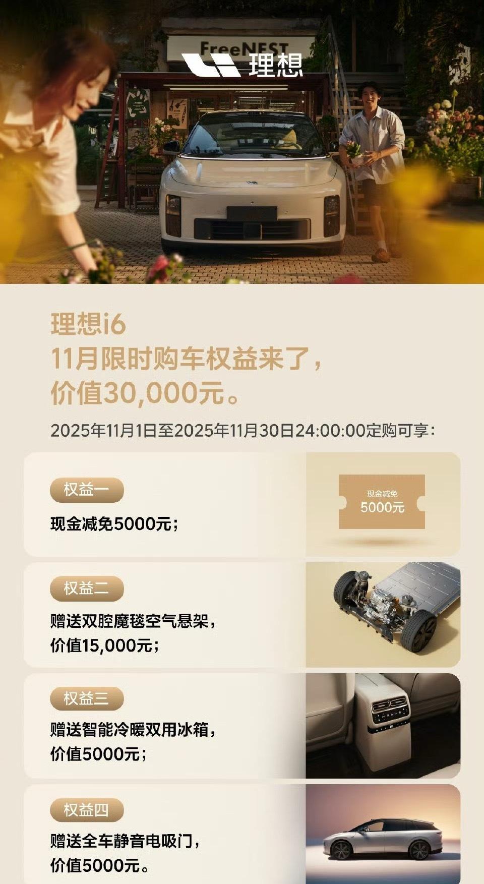 刚刚看到理想i6 11月购车权益来了,感觉还蛮香的,现金减5000元,双腔魔毯空气悬架、智能冷暖双用冰箱、全车静音电吸门,这些都赠送,妥妥的配置升级。理想汽车理想i6