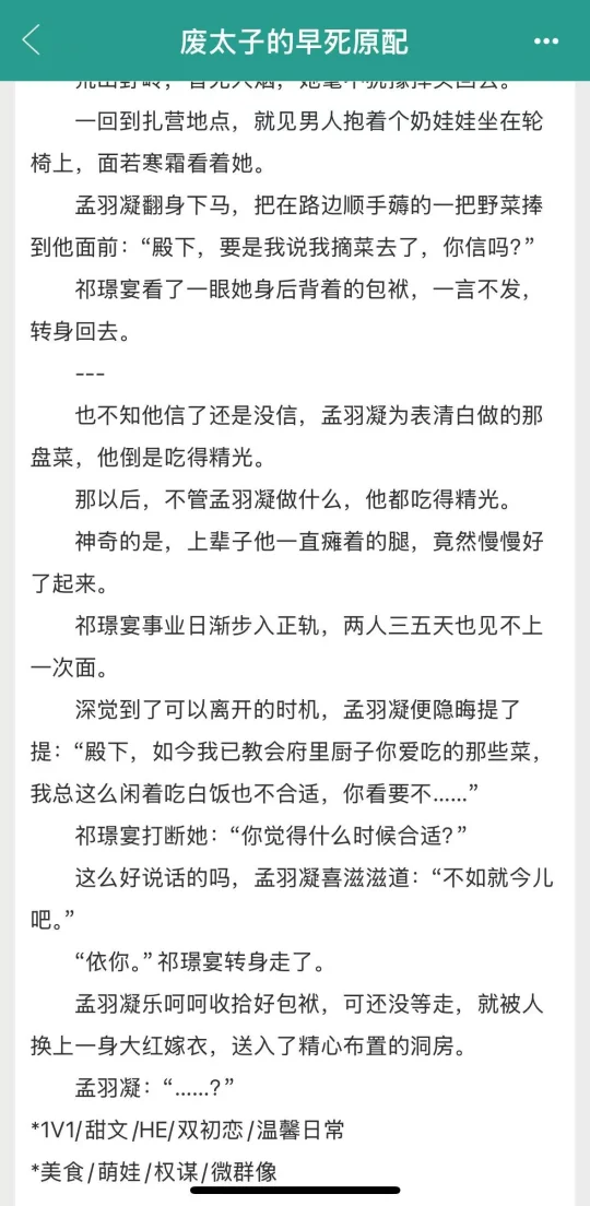 [烟花R]《废太子的早死原配》,作者:吾彩 [烟花R]能干务实 x 隐忍闷骚 [烟花R]古言/先婚后爱/穿书/美食/权谋/群像 [种草R]很温馨治愈的一个故事,作者大大很擅长写这种治愈系古言,很可爱的一个故事。 [种草R]故事里有很多元素穿书、先婚后爱、宫斗权谋、日久生情、美食、萌娃、群像……但元素堆叠在一起,反而给整个故事增加了看点。