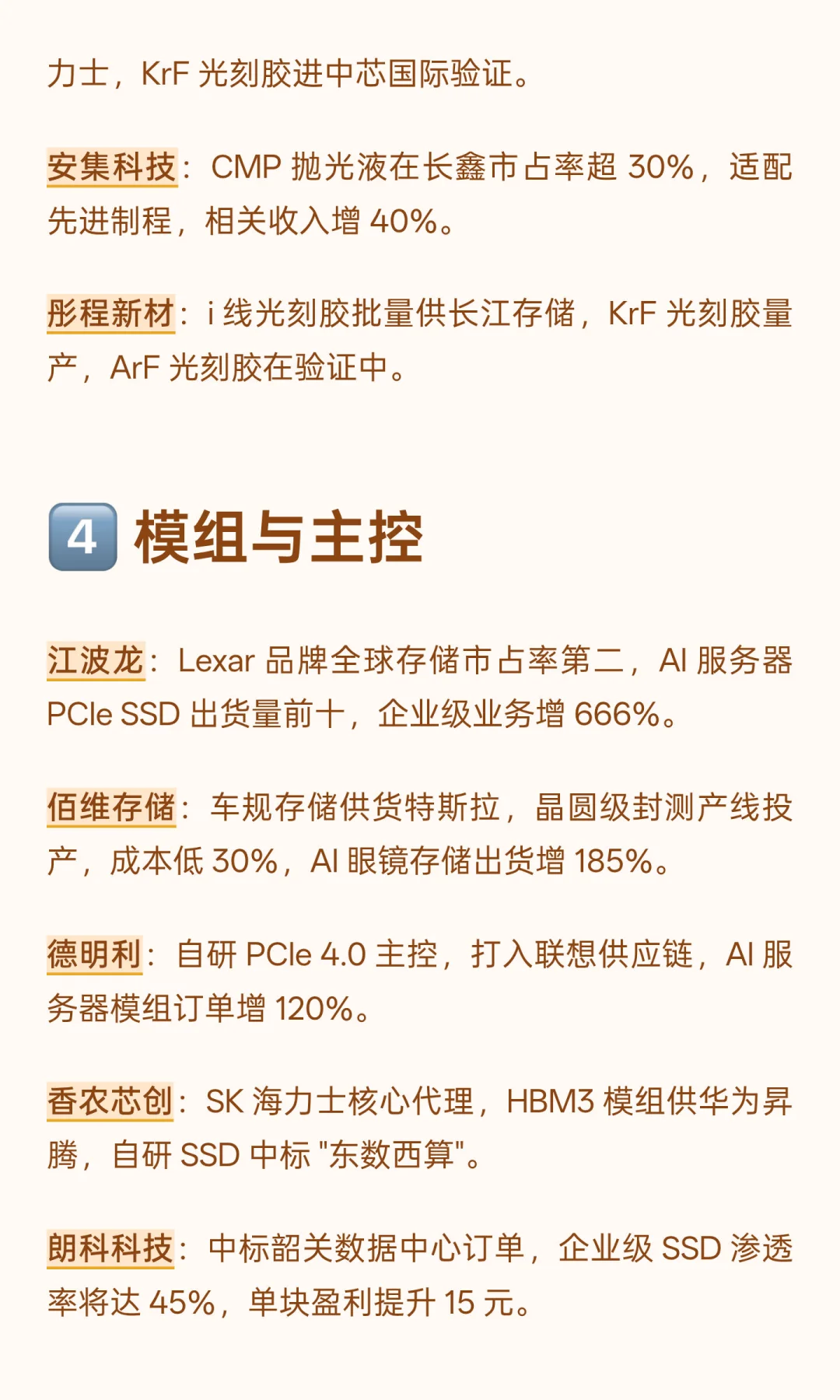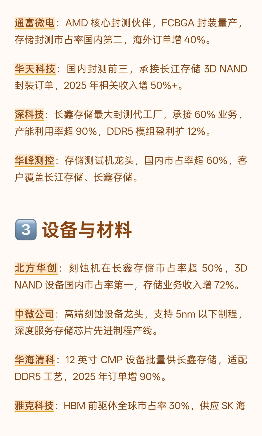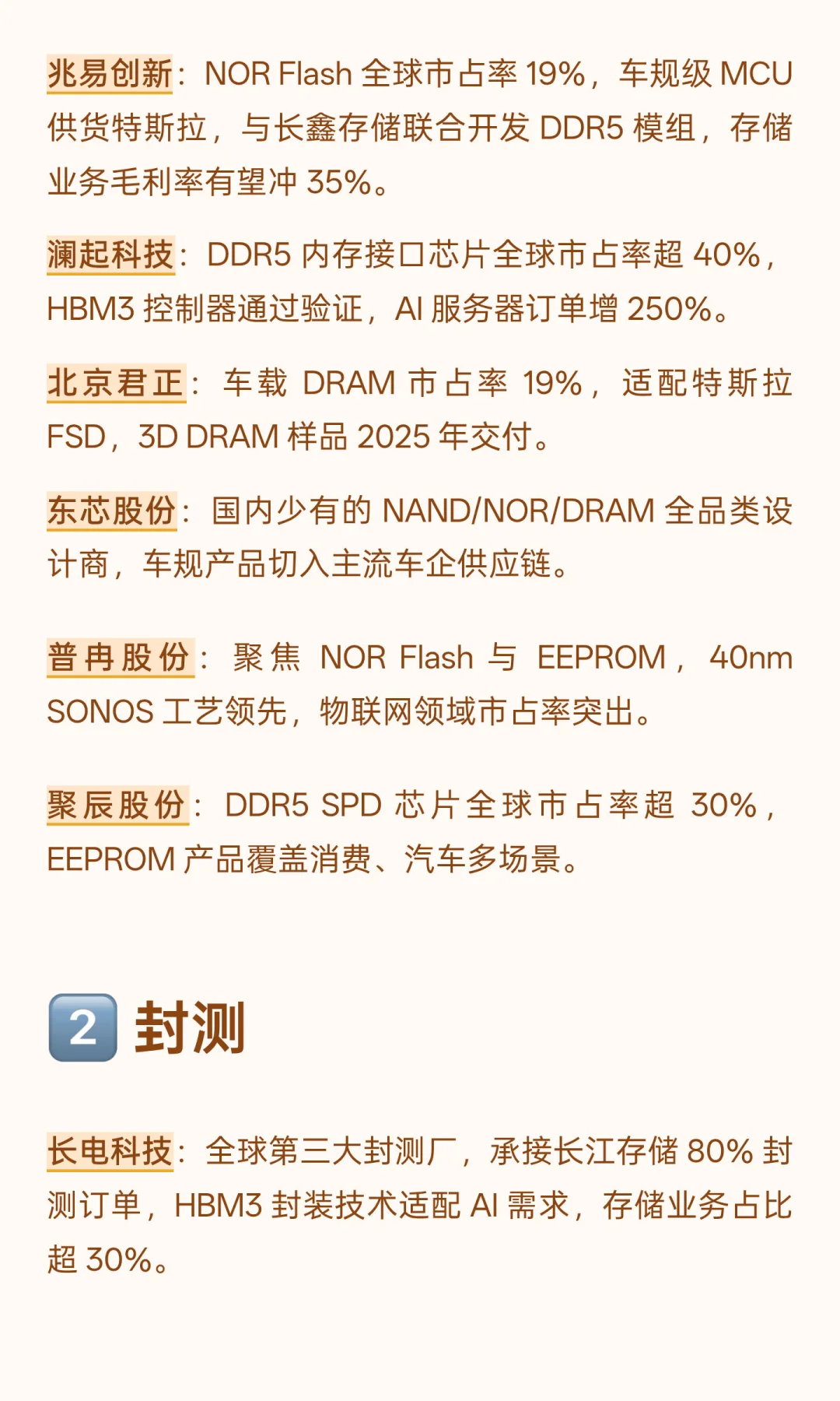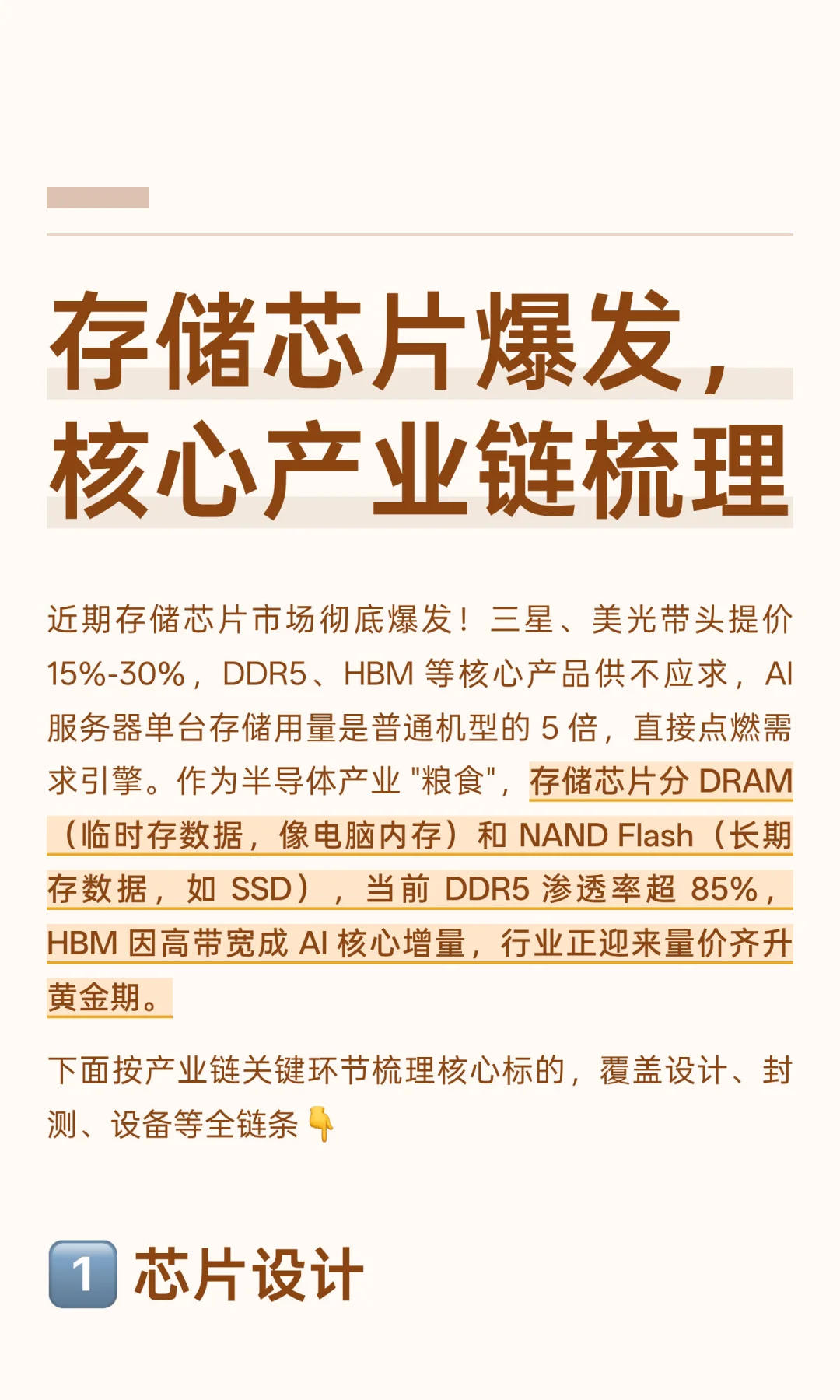 近期存储芯片市场彻底爆发!三星、美光带头提价 15%-30%,DDR5、HBM 等核心产品供不应求,AI 服务器单台存储用量是普通机型的 5 倍,直接点燃需求引擎。作为半导体产业 "粮食",存储芯片分 DRAM(临时存数据,像电脑内存)和 NAND Flash(长期存数据,如 SSD),当前 DDR5 渗透率超 85%,HBM 因高带宽成 AI 核心增量,行业正迎来量价齐升黄金期。 下面按产业链关键环节梳理核心标的,覆盖设计、封测、设备等全链条。👀图文⬆️