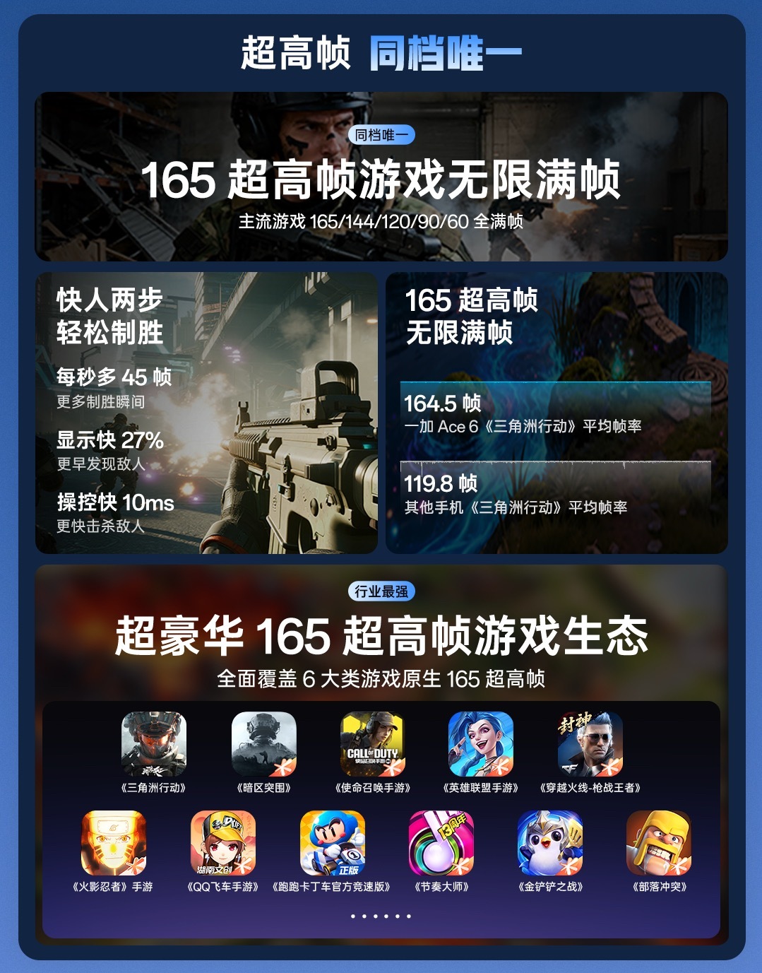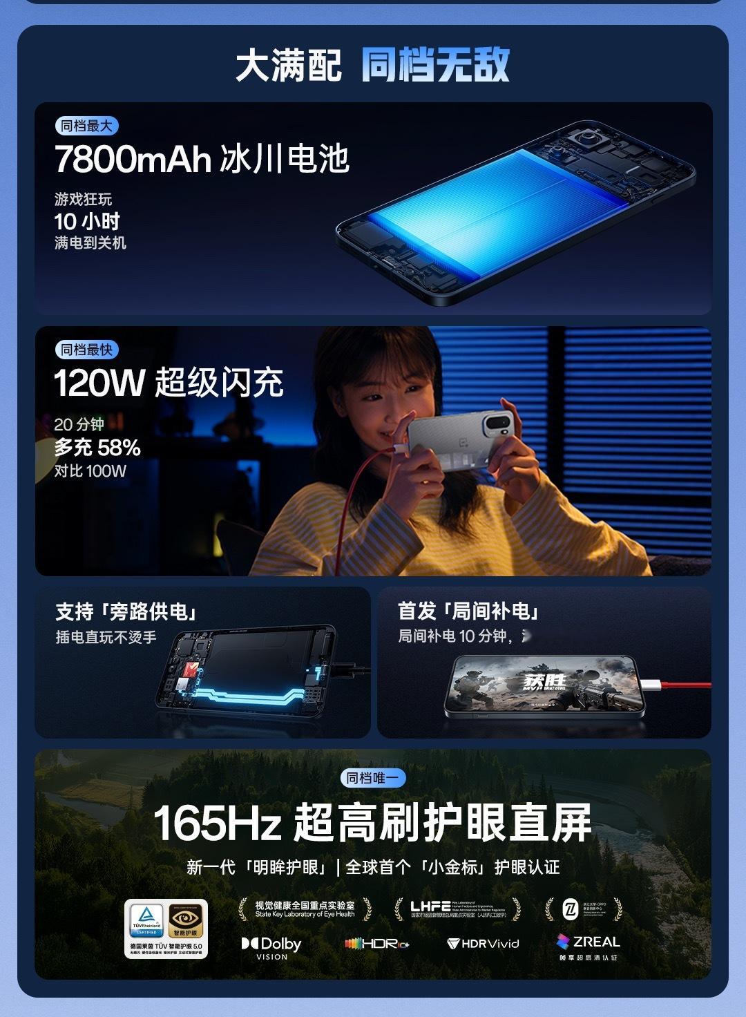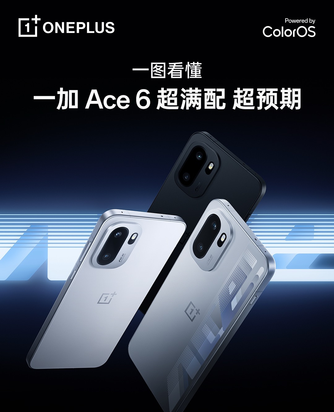 这次还有一台一加Ace 6,屏幕用了一块6.83英寸OLED屏幕,支持165Hz高刷,配备超声波指纹,搭载骁龙8至尊版 + 新一代风驰游戏内核,一加15同款灵犀触控芯和电竞网络芯片G2,内置7800mAh电池 + 120W快充,闪银、亮白、竞黑3个色,厚6.3mm、重213g,后置5000万主摄 + 800万超广角双摄,12 + 256GB版售2599起,[喵喵]你们觉得如何呢?一加Ace6