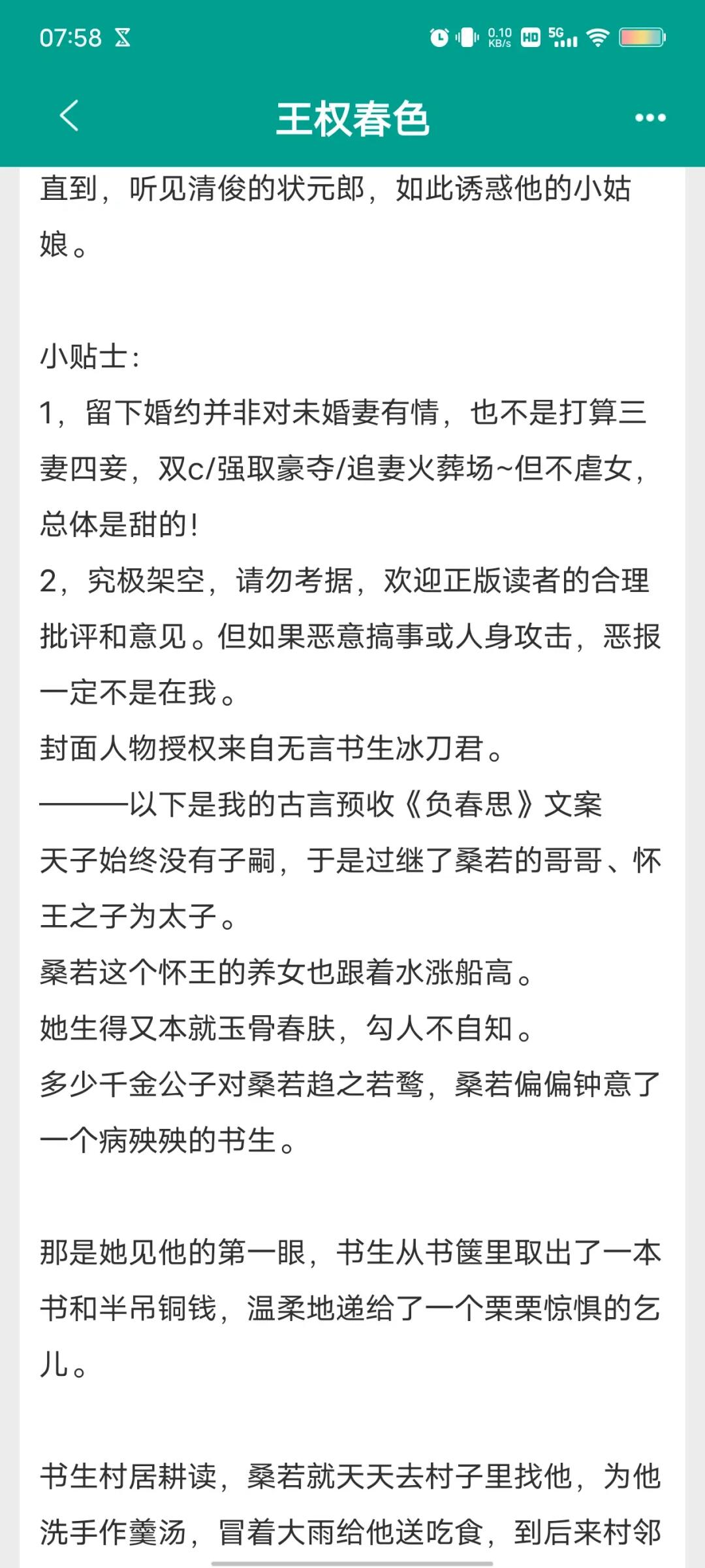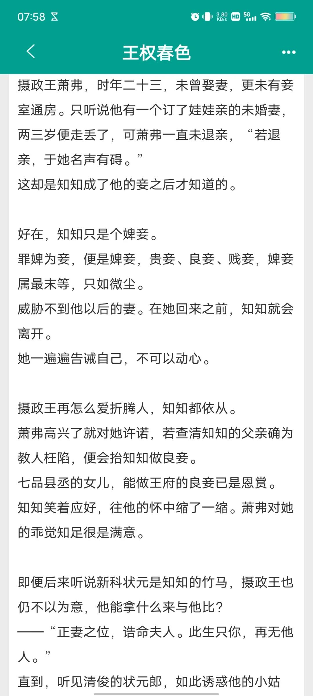 《王权春色》by雪细 23年完结的新文,一共79章。 天真无邪大美人vs权倾朝野摄政王 女主为了救自己父亲,嫁给男主做妾 这个类似的人设我之前还看过一本,下次推 作者排雷小贴士:留下婚约并非对未婚妻有情,也不是打算三妻四妾,双c/强取豪夺/追妻火葬场~但不虐女,总体是甜的!
