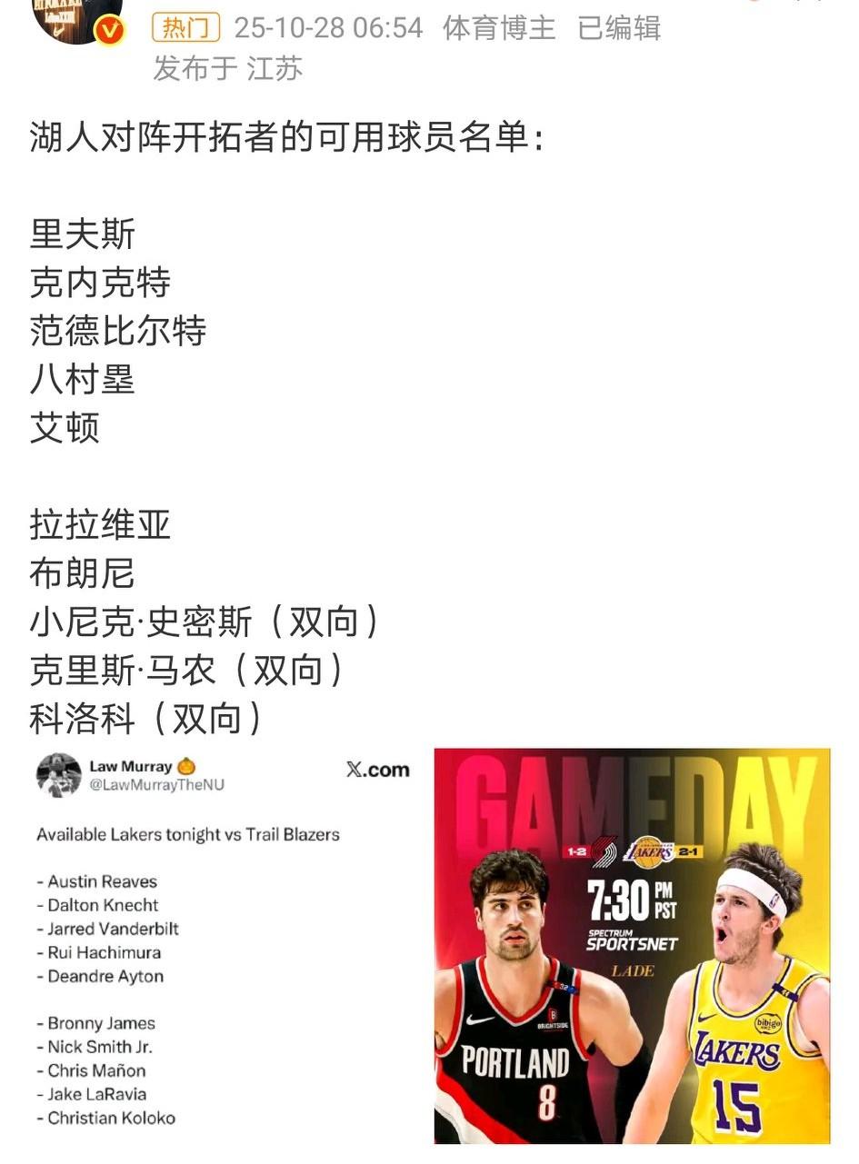 谁敢比我惨!湖人今天对阵开拓者,一共7名球员无法出战,包括3名双向球员只有10名球员可用。 东契奇(左手手指扭伤、左小腿挫伤)、海斯(左膝髌腱炎)、詹姆斯(右侧坐骨神经痛)、克勒贝尔(腹部肌肉拉伤)、斯玛特(右腿股四头肌挫伤)、蒂耶罗(左膝术后恢复)、文森特(左脚踝扭伤)。