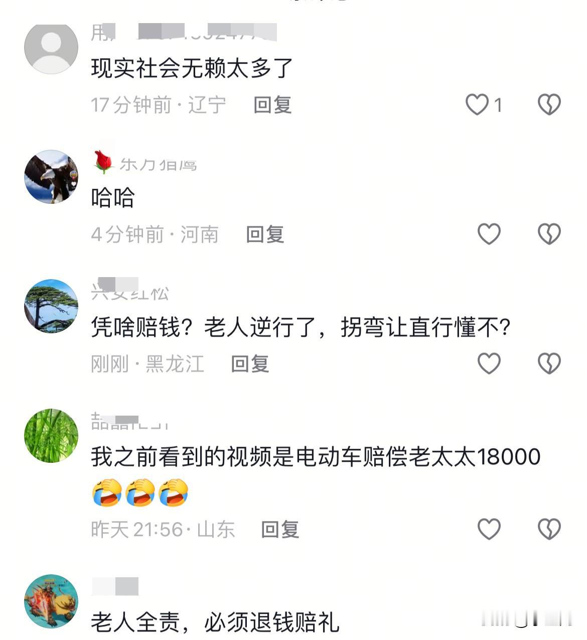 凭什么赔钱!广东,一老人骑车转弯下坡时,居然直接撞向直行的电动车女子,谁知老人不但不道歉,还躺地上大声辱骂女子,女子气不过离开了,然而老人却诬陷女子肇事逃逸。最后处理结果也是窝囊! 明明是老太太撞了人家的电动车,现在却反过来骂女子,还说女子撞人后逃逸,最后女子只能去村委会协商,赔偿老人1800元。这件事才算解决。 女子觉得自己太委屈了,把视频发到了网上,请大家评评理:“凭什么自己要为老人错误买单?凭什么老人就可以为所欲为?” 有网友感到不可思议,气愤的说:“遇到这事还找村委会协商?就应该直接报警,不应该谁的责任谁承担吗? 还有网友说:“女子为什么要赔钱?当时就不应该走,直接躺地上,看谁熬得过谁?” 我觉得这个事,明显就是老人的问题,出了交通事故,女子当时就应该直接报警处理,必须分清责任,不应该是谁老谁弱谁有理! 这样赔钱给她,自己心里憋屈不说,无形中还助长了社会不良风气!大家说呢? (信息来源:法治进行时)