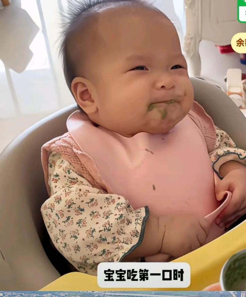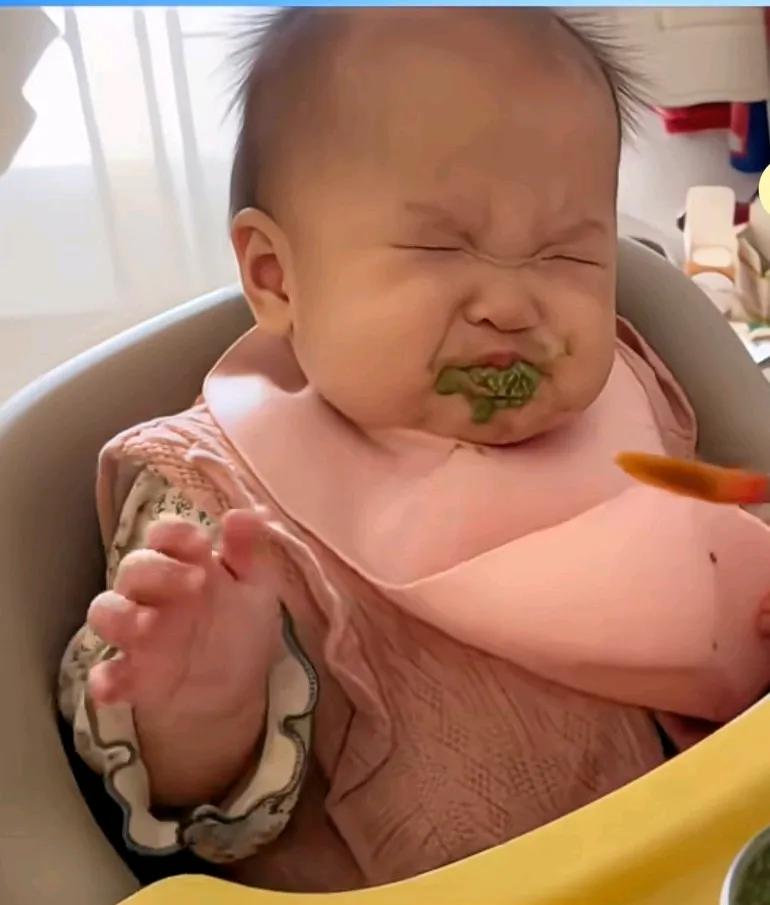 宝宝吃辅食的委屈,坚持,妈妈喂宝宝的第一口,宝宝开心的张口, 结果吃到嘴里立马闭眼, 这是有多难吃呀? 委屈的小表情让人看了忍俊不禁, 但是妈妈喂第二口的时候还是张嘴继续坚持, 吃完又开始挤眉弄眼的, 好像真的很难吃, 这是妈妈做的蔬菜汁, 看着绿乎乎的减肥餐吗。 网友说,我看着都很恶心的样子, 是有多难吃呀, 这是硬着头皮吞下去的, 宝宝吃的都炸毛了。