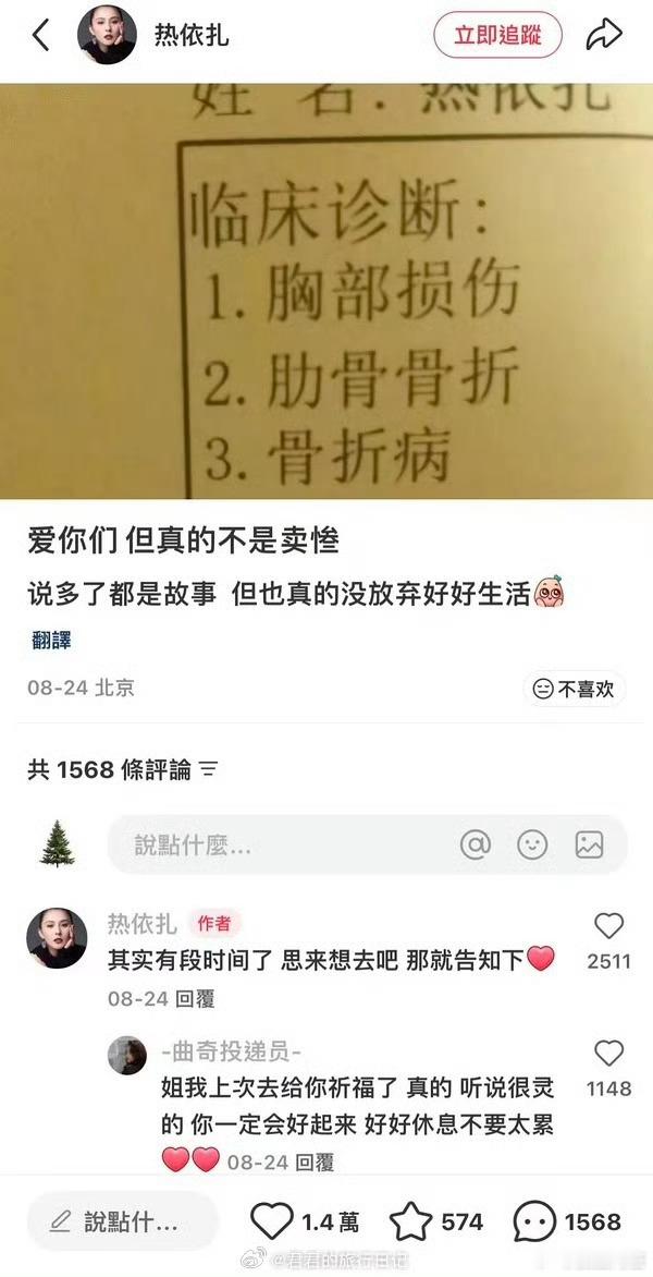 热依扎刚刚发文说没收到《无所畏惧3》剧本也不会出演。她8月就晒过病历,确实身体出