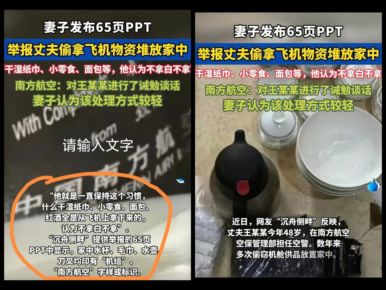 咱就说南航这“惊天盗窃案”,那叫一个绝!一哥们当空警,多年来把飞机上的干湿纸巾、小零食、面包甚至红酒往家搬,家里水杯、水壶全印着“南方航空”。 更绝的是他媳妇,整了个65页PPT举报,从纸巾到矿泉水,一页页列得明明白白,最后算下来赃物价值才180块,跟吃席顺把砂糖橘差不多。 南航处理了,诫勉谈话!网友调侃:领导打开PPT,从懵到最后都得心疼,“小王啊,有困难说啊,生锈烧水壶别拿了,领个新的!” 这谈话一小时,诫勉2分钟,58分钟全是安慰,绝绝子!