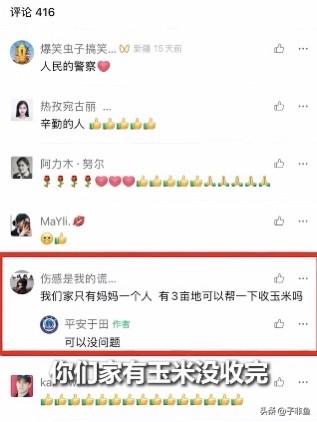 这条评论惊动了警方 近日,一名家在新疆于田县的大学生,在外读大学,心里挂念着妈妈和家里的3亩玉米地,妈妈就一个人干不了那么多的重活,想到了人们警察,他在县公安局视频下方留下这样的评论“我们家只有妈妈1人,有3亩地,可以帮一下收玉米吗?…… 接到求助留言后,民警详细了解了家里情況,20多名民警迅速组队上门,帮忙把玉米收完了,并告诉大学生在外上学不用担心,有困难随时告诉他们…… 好感动,好暖心,人民警察为人民[赞] 图片来自腾讯新闻