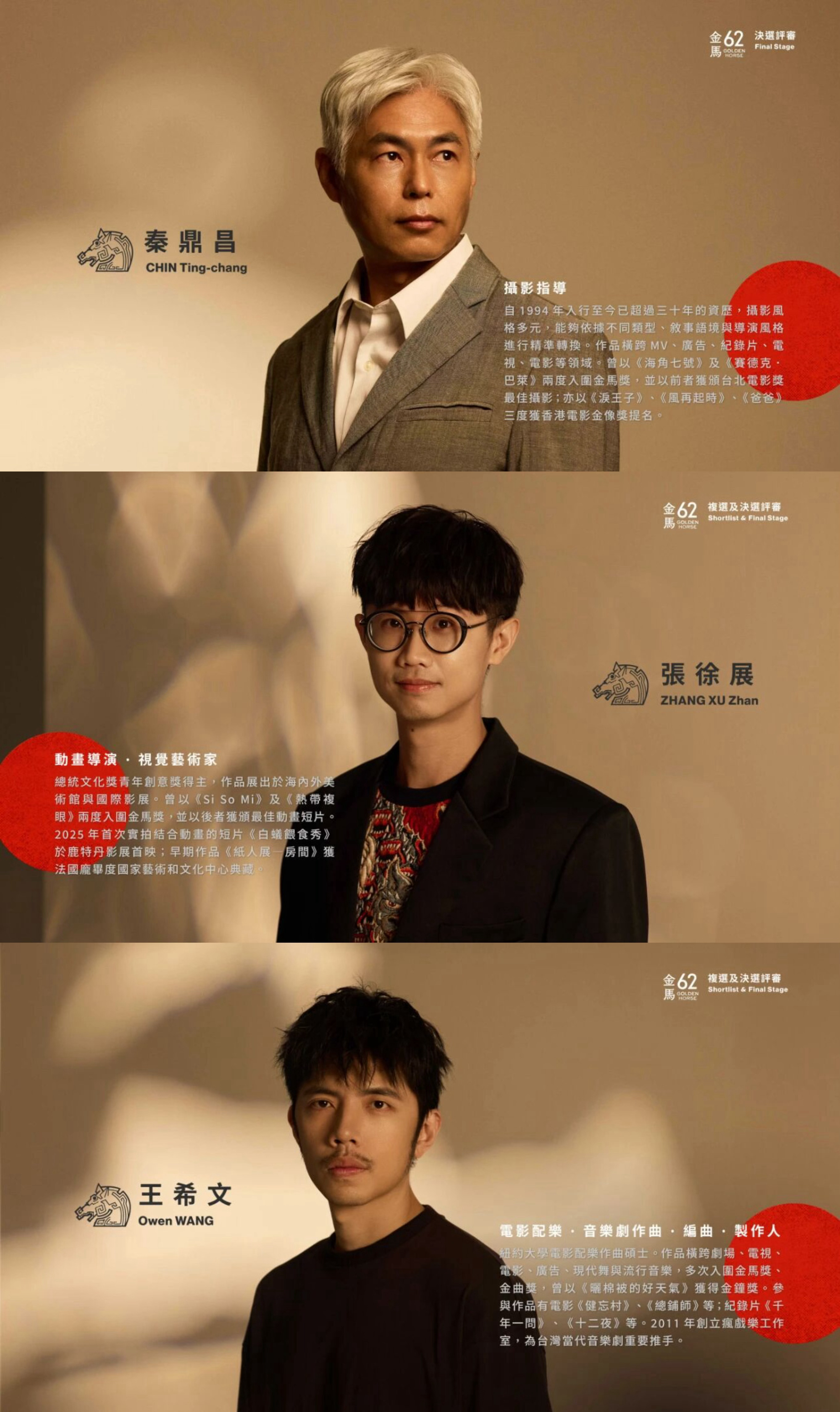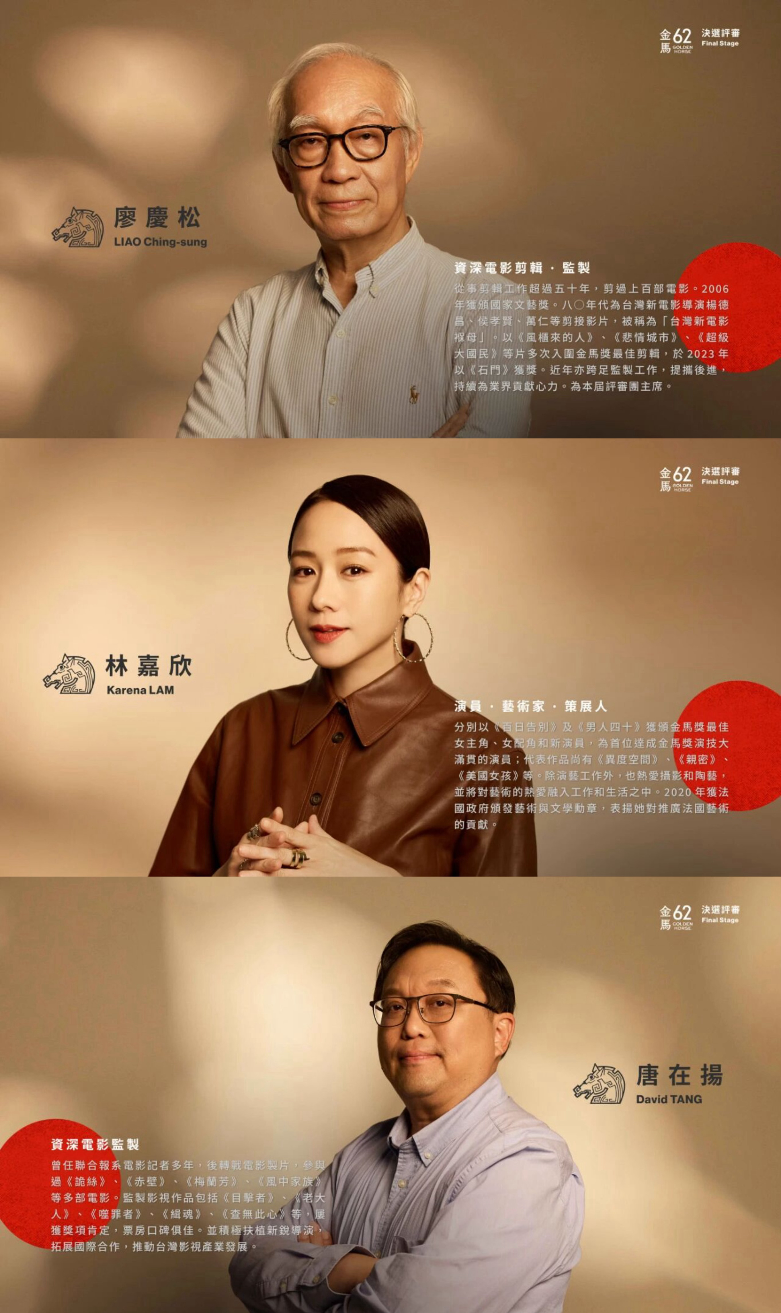 第62届金马奖公布评审团名单,廖庆松担任本届评审团主席,影后林嘉欣,电影导演林书宇、黄信尧担任决选评委,15位评审将决定本届24项金马奖的最终归属。