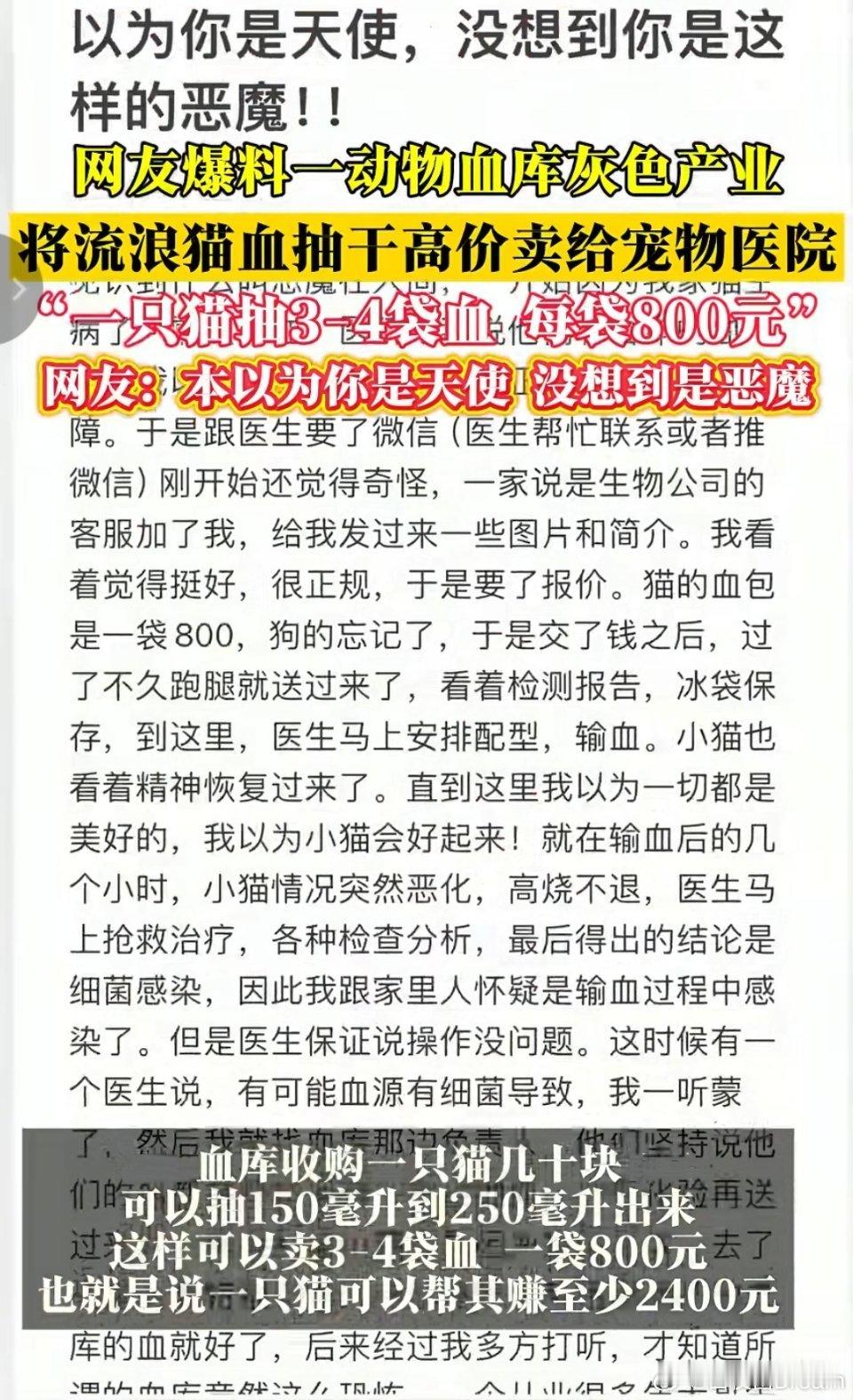 🔻据媒体报道,网友爆料有动物血库将流浪猫血抽了高价卖给宠物医院。的确非常暴利,一只猫几十块,抽3-4袋血,利润你无法想象。