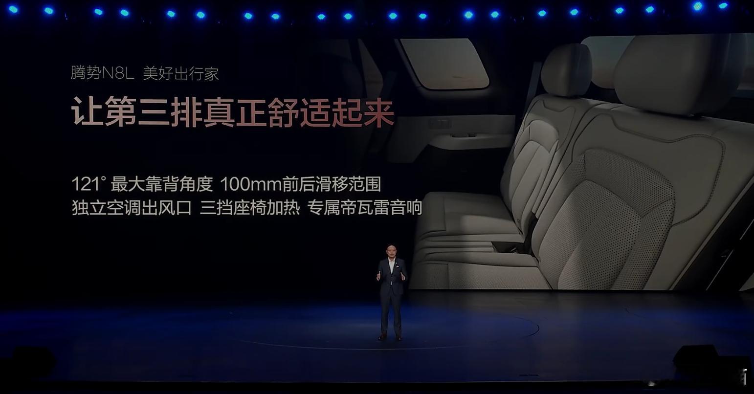 整车内部6.11平方米套内面积,第三排能够前后移动10cm,121度最大靠背角度,独立出风口,专属帝瓦雷音响