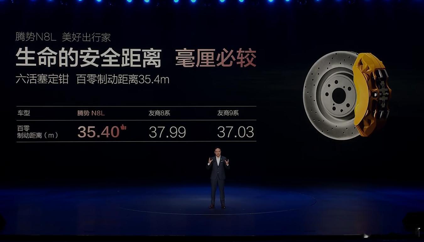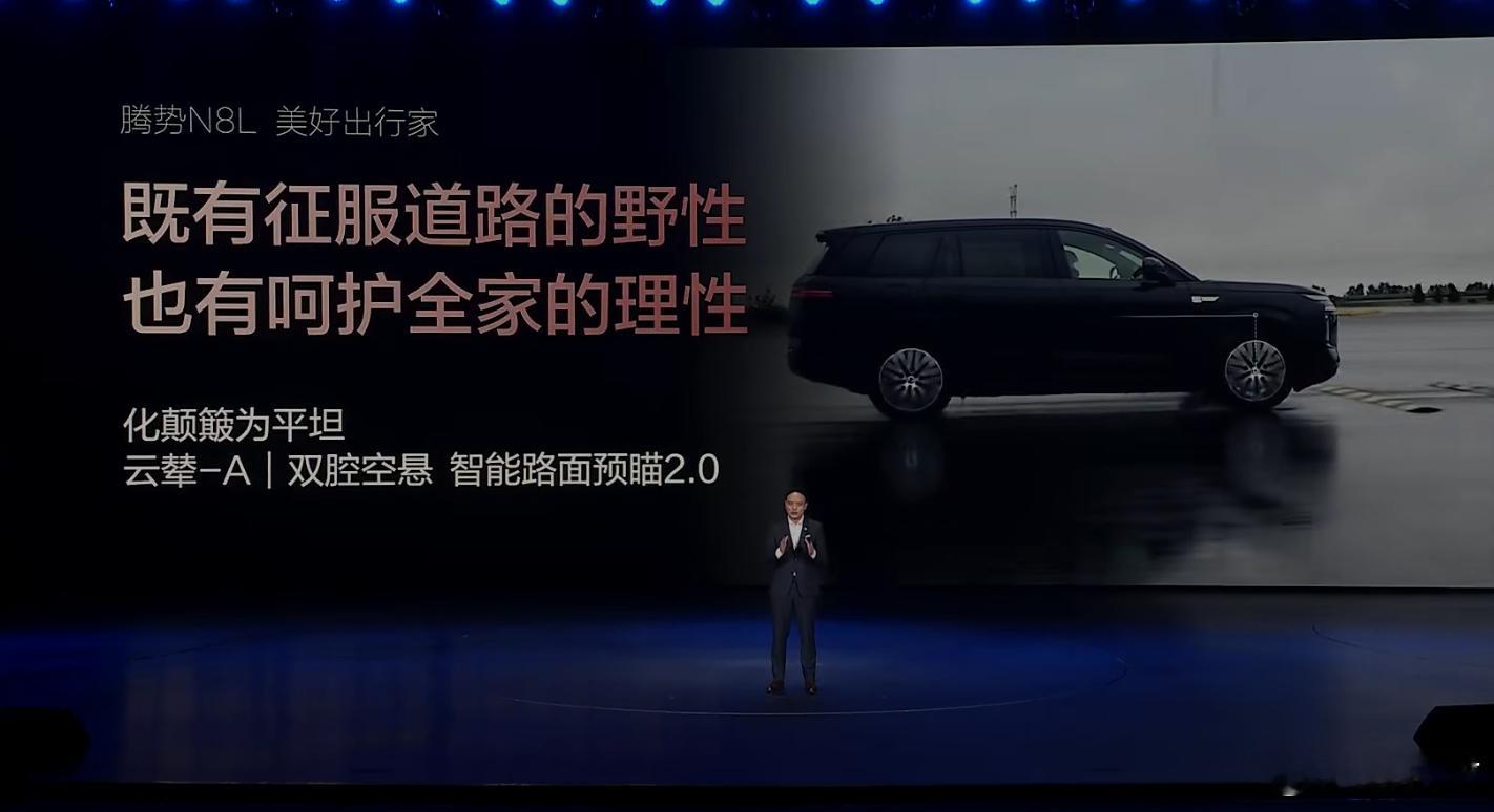 越级价值终极满足,腾势N8L发布,搭载易三方三电机,百公里加速3.9s,插混专用2.0T高效发动机,百公里制动距离35.40m!CLTC纯电续航230km,云辇-A+双腔空悬+路面预瞄2.0,9个安全气囊,轮胎松动会预警,同级领先