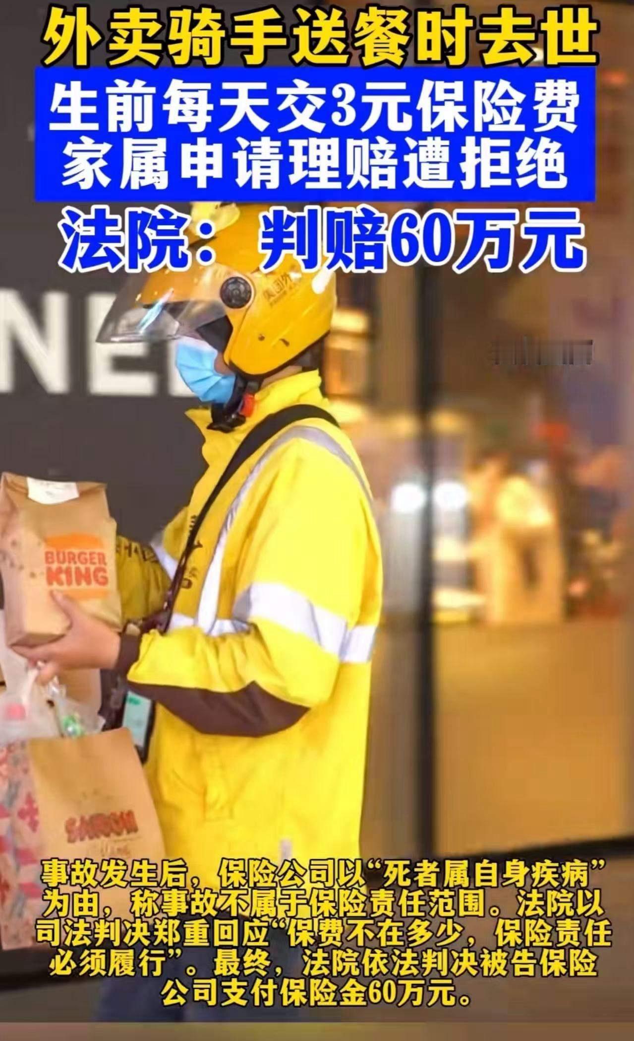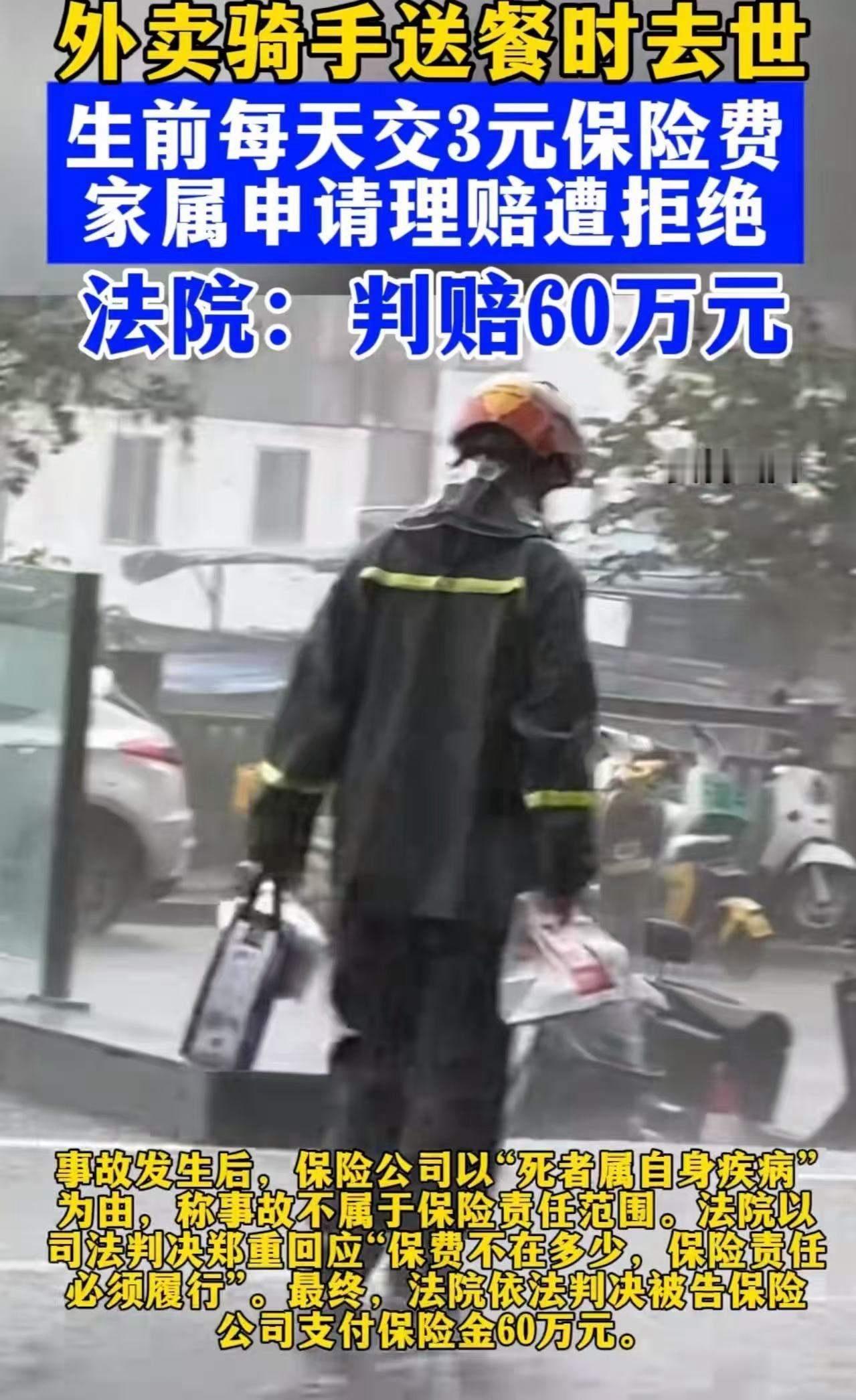 “这次保险公司输了!”郑州,外卖骑手送餐时去世,每天交3元保险费,却遭保险公司拒赔!而法院的判决,大快人心!法院:赔60万!网友:不但要理赔,还要加倍赔偿,不然他们不知道疼,只收钱不赔偿! 这次保险公司输了!郑州,一名默默无闻的外卖骑手,日复一日穿梭在城市的街头巷尾,只为那份微薄的收入,为家人撑起一片天。每天只需交3元保险费,他相信,保险是他在这个快节奏城市中最坚实的后盾。然而,令人心碎的是,命运却在关键时刻狠狠地给了他一记重击。 就在他送餐途中,不幸发生了事故,生命永远定格在了那一瞬间。令人愤怒的是,事后保险公司却以各种理由拒绝赔偿!这不仅是对一名普通劳动者家庭的巨大伤害,更是对所有默默奉献的劳动者的一次深刻警醒。你是否曾想过,自己每天辛苦缴纳的保险费,究竟是为谁服务?是为了在关键时刻得到保护,还是变成了商家的“利润工具”? 法院的判决犹如一股清流,狠狠地打了那些只知道“收钱不赔偿”的保险公司一个响亮的耳光。判决:赔偿60万元!这不仅是对逝者家庭的慰藉,更是一种对行业乱象的有力反击。网友们纷纷发声:“不但要理赔,还要加倍赔偿!否则他们不知道疼,只知道收钱不赔偿!”这句话,道出了无数人心中的愤怒与无奈。 我们不得不反思:保险的本质到底是什么?是风险的转移,是保障的承诺,还是变成了某些企业的“赚钱工具”?当一份看似简单的保障变成了“只收钱不赔”的黑洞,谁又能真正安心?更重要的是,这起事件再次唤醒了公众的关注:在我们为生活奔波的同时,是否也在无形中成为了某些企业的“韭菜”? 这个事件背后,隐藏着更深层次的人性问题——利益至上的冷漠、制度的漏洞、对普通劳动者权益的漠视。这不只是一起事故的赔偿问题,更是社会公平与正义的试金石。我们期待,法律的公正能够还给每一个普通人应有的尊严和保障,也希望那些只知道“收钱不赔”的企业,能从这次教训中醒悟。 因为,社会的温度,正是在每一个被保护的瞬间体现出来的。每一份保险,都是对生命的尊重和承诺。让我们共同期待,未来的社会里,没有人会因为一场意外而陷入绝望,没有人会因为制度的缺失而失去应有的保障。因为,正义从来都不会缺席,它只是需要我们每一个人的坚持和呼吁。 这场“保险之战”,远不止是一个案件的胜利,更是一场唤醒全民意识的行动。我们要让那些只知道“收钱不赔”的企业明白,社会的良心和正义,是无法用金钱衡量的。每一个普通人,都值得被尊重和保护。让我们用行动,支持每一个在风雨中坚持的劳动者,让公平正义的光芒,照亮每一个角落。外卖事故