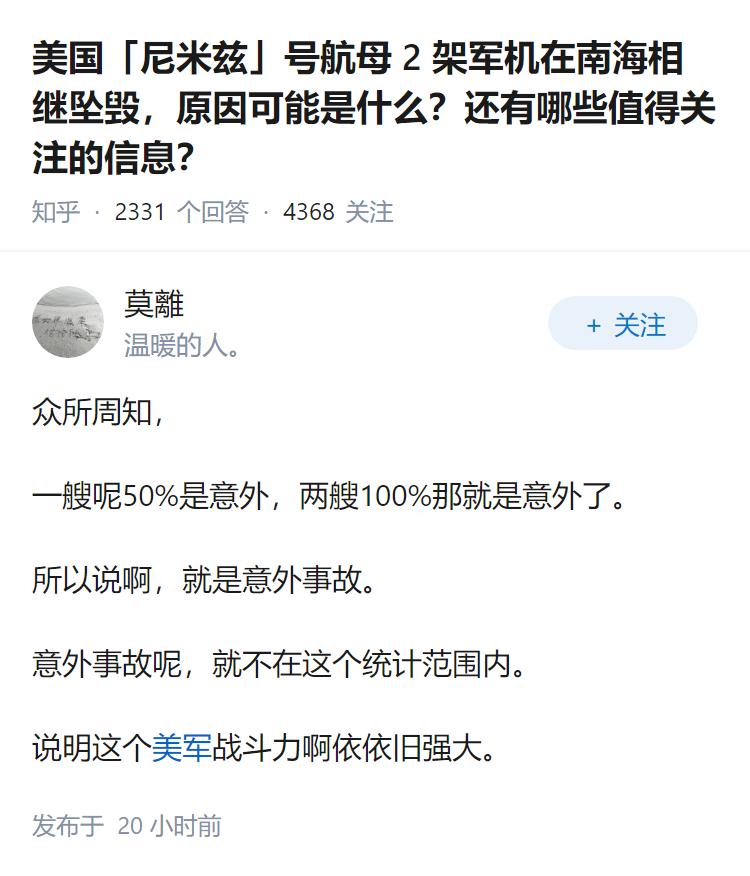 美国「尼米兹」号航母 2 架军机在南海相继坠毁,原因可能是什么?还有哪些值得关注的信息?