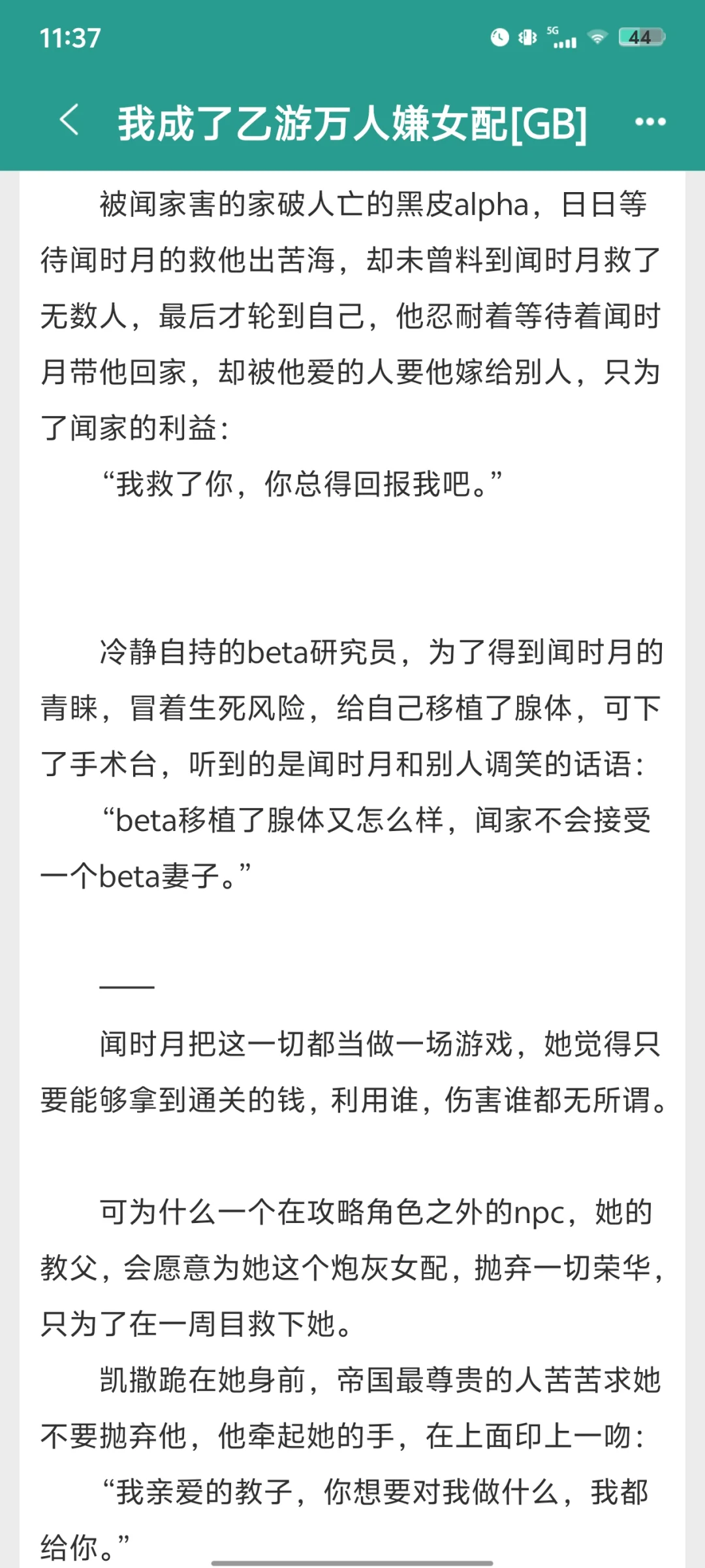 《我成了乙游万人嫌弃女配》by超高校级的卷王 正在连载的小说 [种草R]女主穿越到一款手游里,成了顶级的Alpha。按照系统指示,完成任务,就可以治好自己的病。就这个GB爽!女主超强塑造得很有魅力,男生子,有正宫。 [桃子R]女主一周目的时候认认真真攻略男主们,却在进度99%的时候失败了,还得了信息素紊乱症。二周目开启,女主只做好炮灰该做的事,那些嫌弃她的男主们开始贴上来了,全局尽在女主掌握之中。