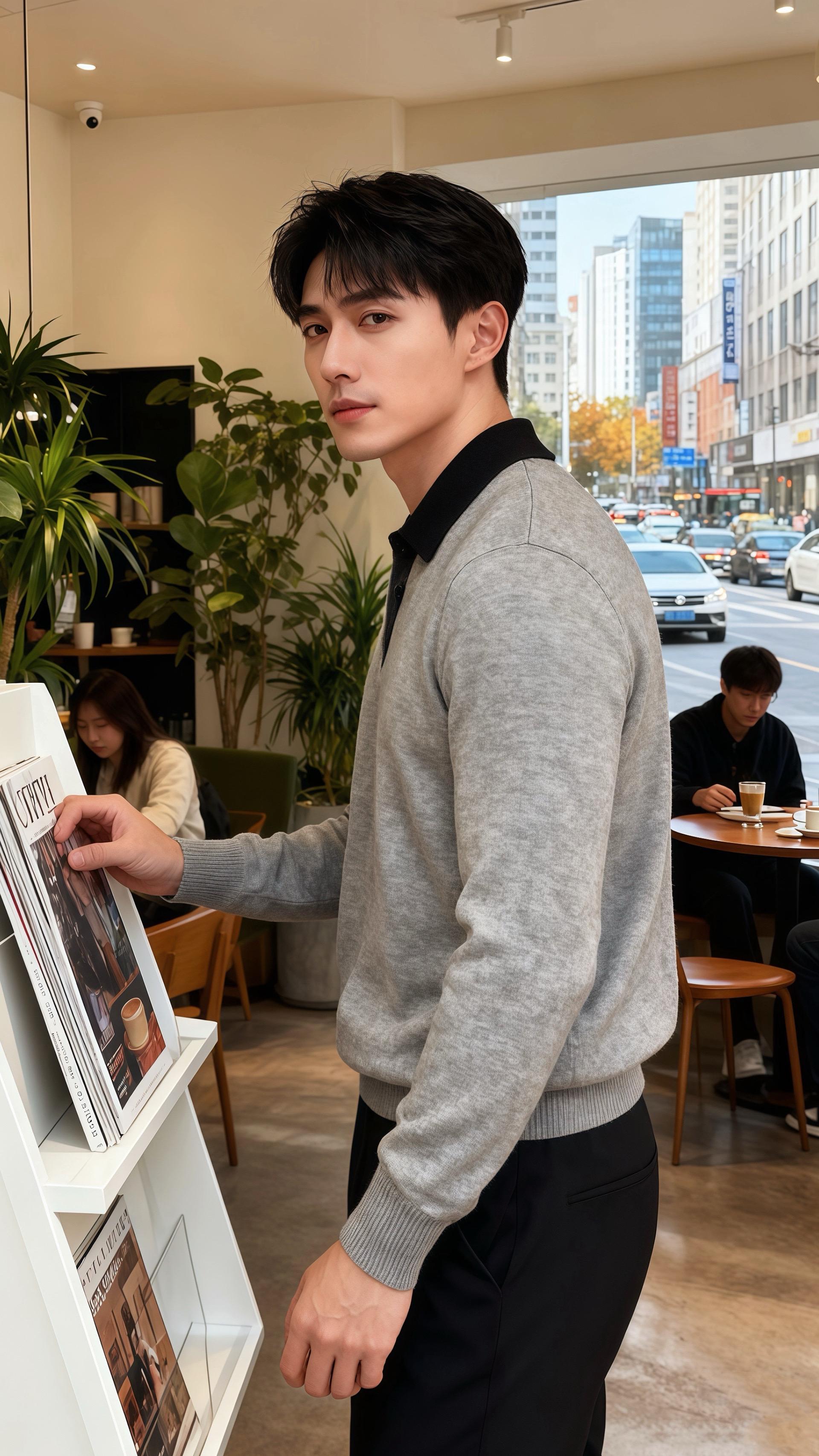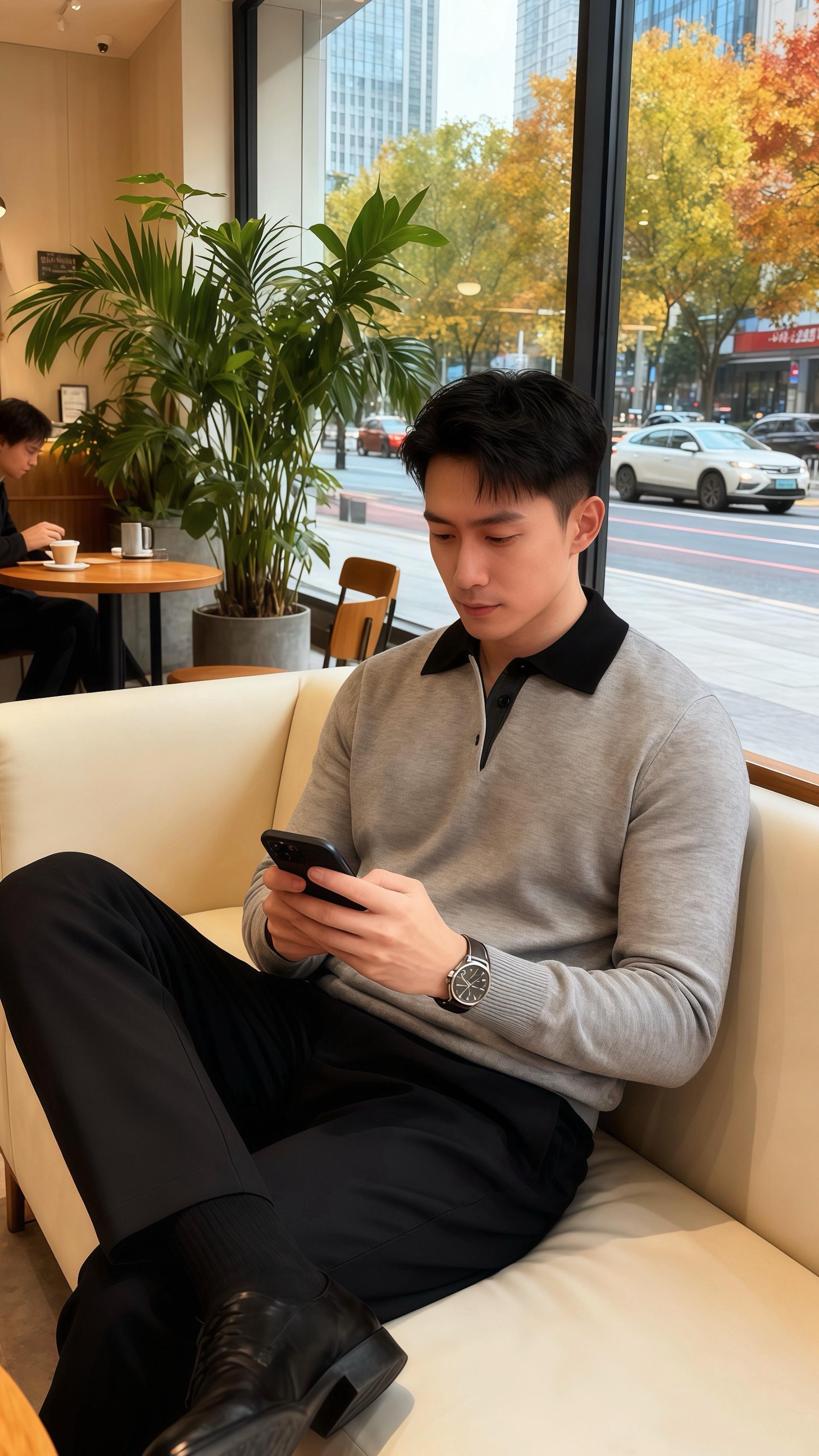 他穿的灰调针织衫衬得肩线很舒展,领口那圈墨黑像揉进了秋的温软,配着垂感恰好的黑裤,连指尖捻杂志页的弧度都裹着松弛。许妍指尖蹭过耳侧的碎发,声音轻得落进咖啡香里:“你今天这身,像把窗外的银杏光都织进了衣服里。”