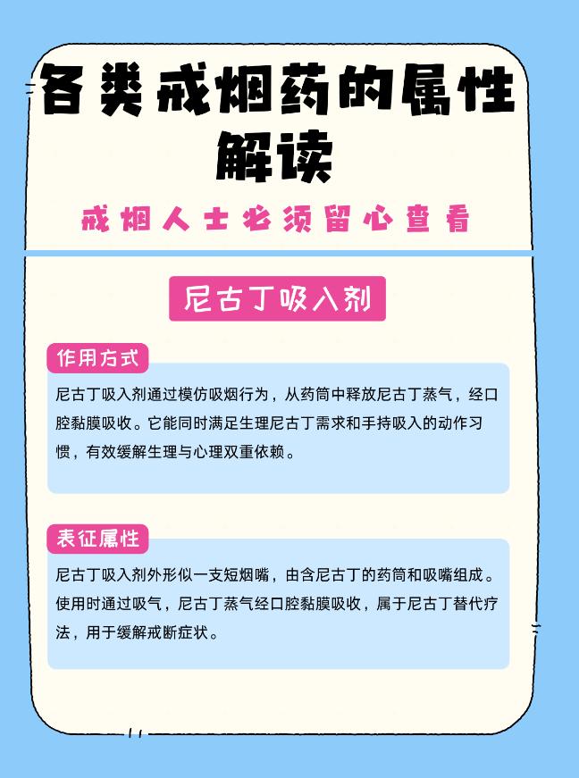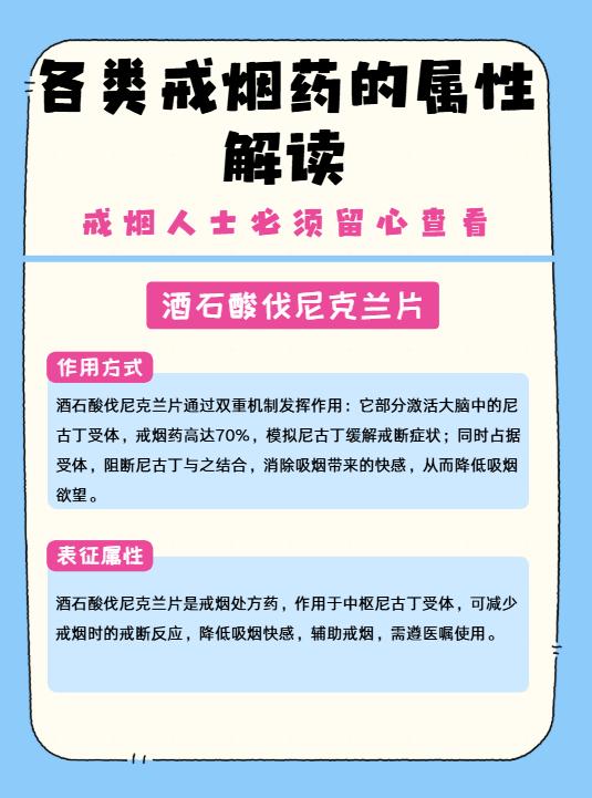 表征属性:是戒烟处方药,作用于中枢尼古丁受体,可减少戒烟时的戒断反应,降低吸烟快感,辅助戒烟,需遵医嘱使用。