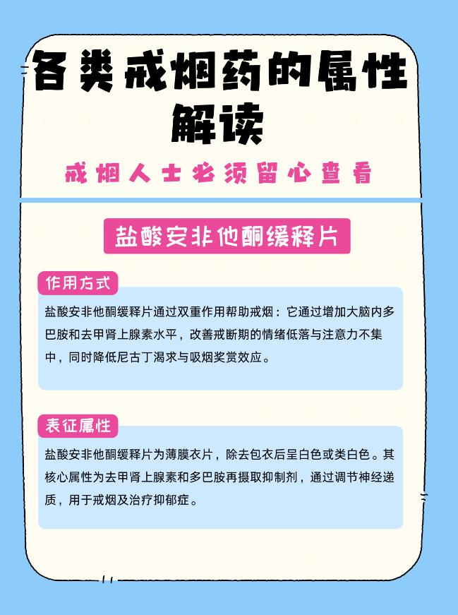 作用方式:通过双重作用帮助戒烟,增加大脑内多巴胺和去甲肾上腺素水平,改善戒断期的情绪低落与注意力不集中,同时降低尼古丁渴求与吸烟奖赏效应。