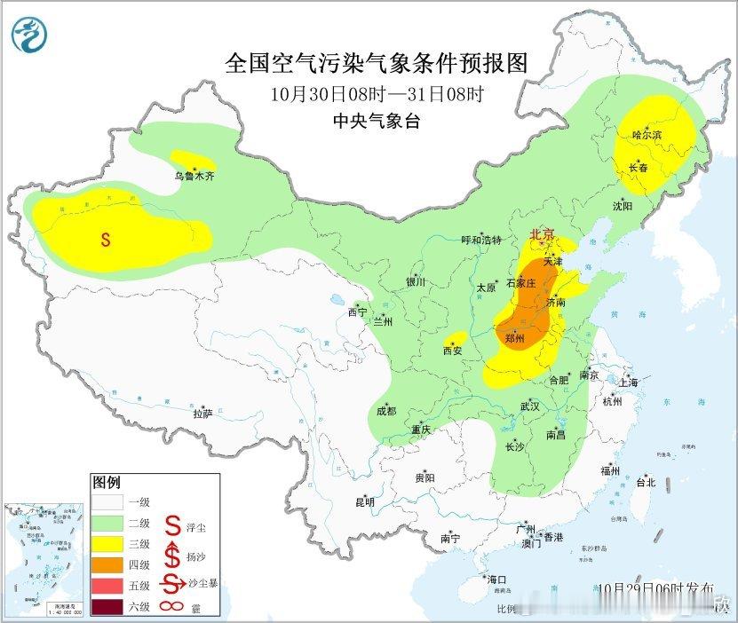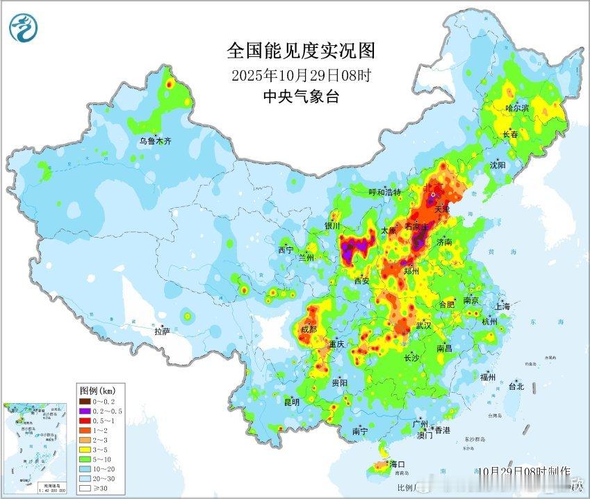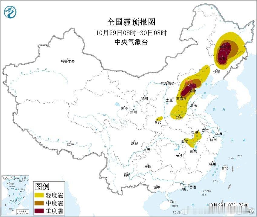 【雾和霾】今晨北京、天津、河北、河南、山西、陕西、甘肃等地出现了大雾,部分站点能见度不足200米,出现强浓雾。从空气质量看,京津冀一带存在轻度-中度污染,雾混着霾。此外,黑龙江吉林一带有中度-重度污染,也有霾。