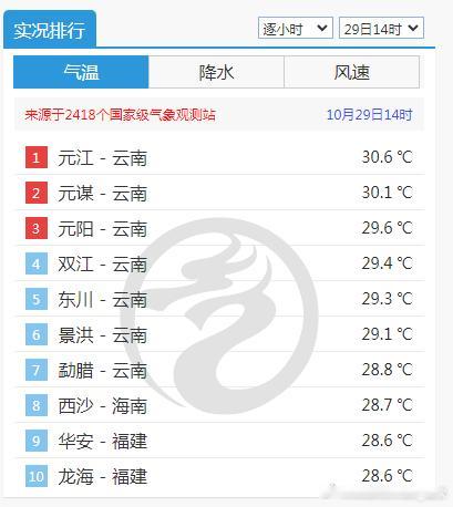 【气温——云南三元上榜】今天14时气温排名,云南的元江、元谋、元阳,位列前三。元江和元阳处于红河河谷,元谋处于金沙江附近的河谷中,海拔较低。因此在冬半年,经常登上气温榜。