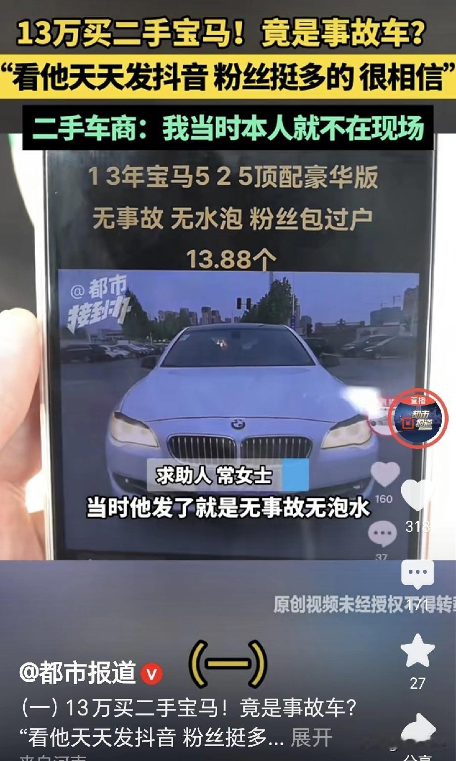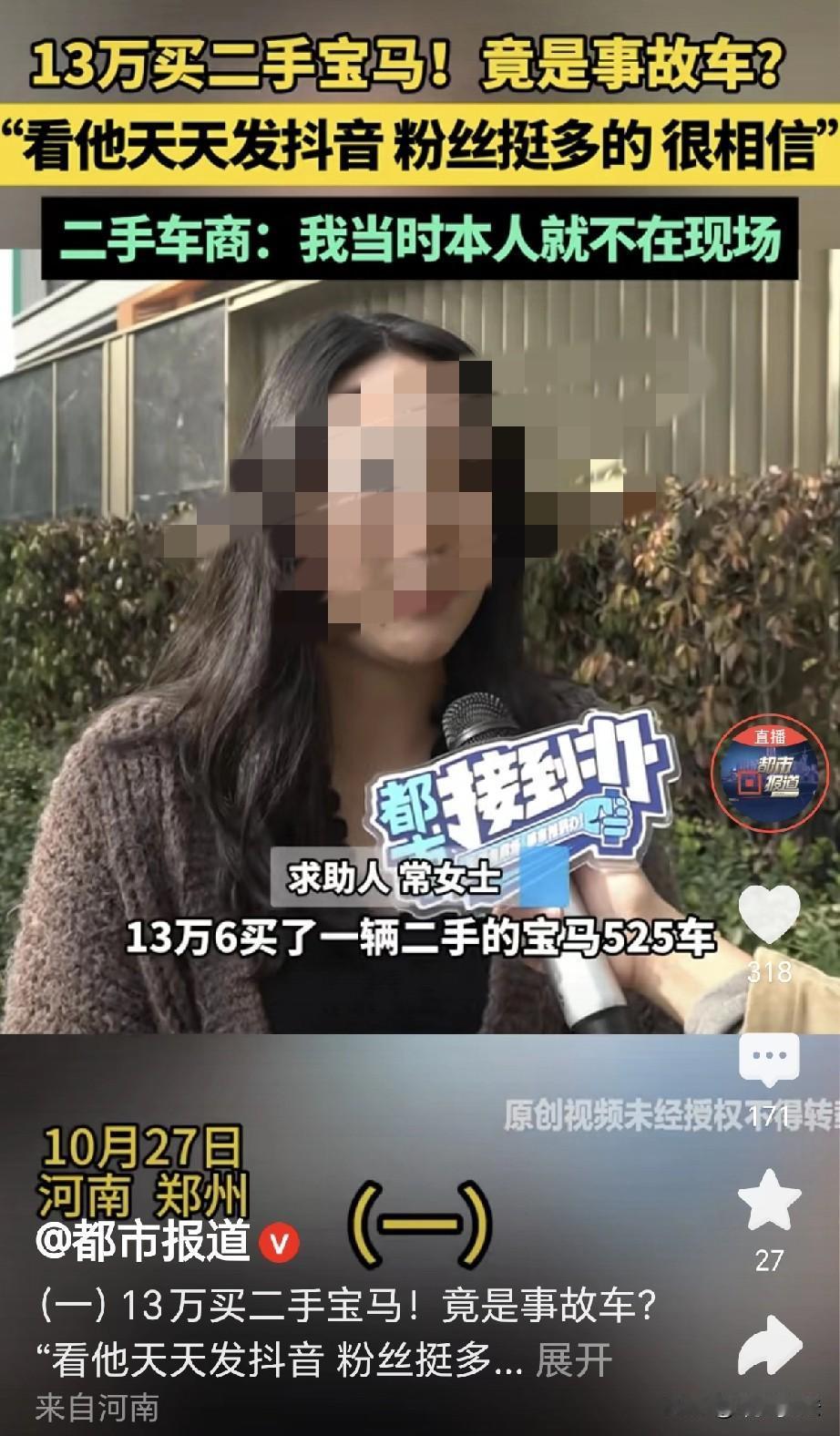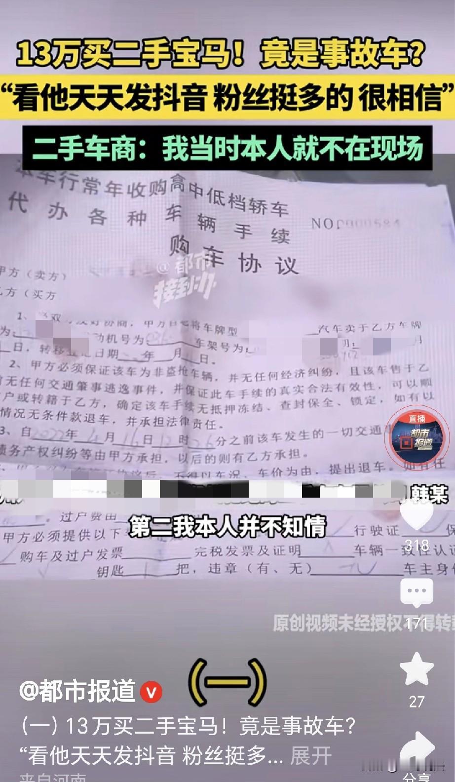 河南郑州,一女子花136000元,买了一辆二手宝马525车,合同上写着,无泡水无事故,谁知女子开车,老是出问题,三次都被停在半路,女子一测,哪哪都是问题,发动机、前挡风玻璃都被换过,女子认为,这是重大事故,属于欺诈,她要求退一赔三,她找卖车之人,对方却说,车不是他的,和他没有关系,他没签字,钱也没打到他的账户,不行可以起诉,女子告到法院,判决下来,女子傻眼了。 常女士闲来无事,待在家里刷短视频,她刷着刷着,突然看到一个卖二手车的,发布了卖车视频,常女士一下就被吸引了过去。 常女士看到,对方主页上写着,所有车辆都是全款,所有车源都是批发,所有粉si都包过户。 常女士好奇,直接点进了对方的视频,视频里一辆13年的宝马525,标价13.88万,常女士怦然心动。 常女士最爱面子,宝马车是她最喜欢的品牌之一,如果要买一辆新的,按照她的财力,就会感到特别吃力。 常女士观察,发现有好多人在视频下方,给了评论,评论不错,视频里的宝马看起来十分不错。 22年4月16日,常女士根据对方留下的电话,联系到对方,对方是一男子韩某。 韩某自始至终都没有露面,他告诉女子,车在他姐那里,要常女士自己去看。 常女士又问,如果购买车子,钱要交到哪里,韩某表示,交给他姐就可以了。 常女士十分高兴,独自来到了二手车行,她和韩某姐姐沟通,俩人谈好了车辆的价格,是136000元。 签合同的时候,常女士看到,合同上专门写着,车辆无事故无泡水。 常女士出于谨慎,又给韩某打去了电话,韩某告诉她没事,钱交给他姐就行。 常女士这才放下心来,把钱转给了对方,常女士买下来车,高高兴兴把车开回了家里。 可是,她万万没有想到,车辆在行驶途中,经常会出现问题,曾经有过三次外出,都停在了半路之上。 常女士心里害怕,把车开到店里检测,工作人员告诉她说,这车是一辆重大事故车。 常女士心里一沉,立刻就在查博士上检测,发现车辆哪哪都是问题,发动机和挡风玻璃都被换过。 常女士气的想哭,这不就是重大事故车吗?她心里难过,认为对方这是欺诈,她联系韩某,想要讨个说法。 谁知韩某显示关机,她已经联系不上对方,女子没有办法,找到记者寻求帮助,她一五一十,向记者陈述了自己的遭遇。 记者陪同女子,来到二手车店里,谁知店里工作人员表示,韩某并不在这里。 常女士十分难过,她已经联系不上韩某,工作人员帮忙打了电话。 可接通之后,韩某向记者表示,合同上并不是他本人签字,他本人对此并不知情。 并且,他也没有到现场,常女士的钱也没有打到他的账户上。 可记者发现,合同上有韩某的签字,还有他的身份证号,既然车不是韩某的,为啥合同上不但有他签字,还有他的身份证。 韩某表示,常女士只是找人家去买车辆,他不知道合同上为啥要写他的名字,他也不可能授权的。 但常女士不这么认为,车辆是你介绍的,是你说那是你姐,可以直接去找,我交钱的时候,还很谨慎,我还问你,你说没事。 可韩某却说,他没有姐,在河南这里,哥哥姐姐,只是一个称呼而已。 常女士看他不认账,告诉他说,你们都是骗局,我是通过你了解的这辆车,你现在说跟你没任何关系。 韩某却说,是常女士本人去的,常女士质问,我怎么去的?是你给我发的位置! 这个事故车把我停在路上3次,幸亏是我命大! 但韩某坚称,车辆不是他的,常女士更加生气,是你在短视频上发的,我有证据。 韩某理直气壮,反而回怼: 你的意思是,别人的车只要我发了,所有人就应该来找我? 常女士说他无 赖,韩某让她去法院起诉,法院该怎么判就怎么判,他认法律的判决。 可记者看到,判决书上显示,常女士并没有确定签订人真实身份,也没有见到签订人持有韩某的授权委托书。 因此法院认为,不足以认定该签订人有权代理韩某。 《民法典》第148条规定: 一方以欺 诈手段,使对方在违背真实意思的情况下实施的民事法律行为,受欺诈方有权请求法院予以撤销。 在这件事中,卖车方在合同中注明,车辆无事故,无泡水。 但常女士在实际使用中才发现,车辆总是出现问题,车辆发动机和挡风玻璃都被换过,属于重大事故车。 这就构成了故意隐瞒真实情况的欺诈行为,常女士作为受欺 诈 方,有权请求撤销合同。 《民法典》第171条规定: 行为人没有代理权、超越代理权或者代理权终止后,仍然实施代理行为,未经被代理人追认的,对被代理人不发生效力。 韩某表示,合同不是他本人签字,他也未曾授权他人签字,并且,他在事后也没有确认该行为。 常女士未能确定签订人的真实身份,也未见到授权委托书。 因此法院认为,不足以认定签订人有权代理韩某,该合同对韩某不发生效力。 韩女士无可奈何,只有劝告大家,买东西一定要小心谨慎! 对此,你怎么看?欢迎评论区留言讨论。 关注@王哥说法 多学法律少吃亏!