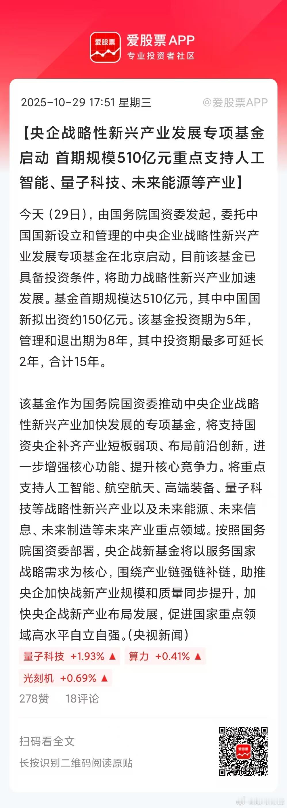 盘后科技又来利好,510亿央企新兴产业基金落地,聚焦人工智能、量子科技、航空航天、高端装备等前沿科技方向!