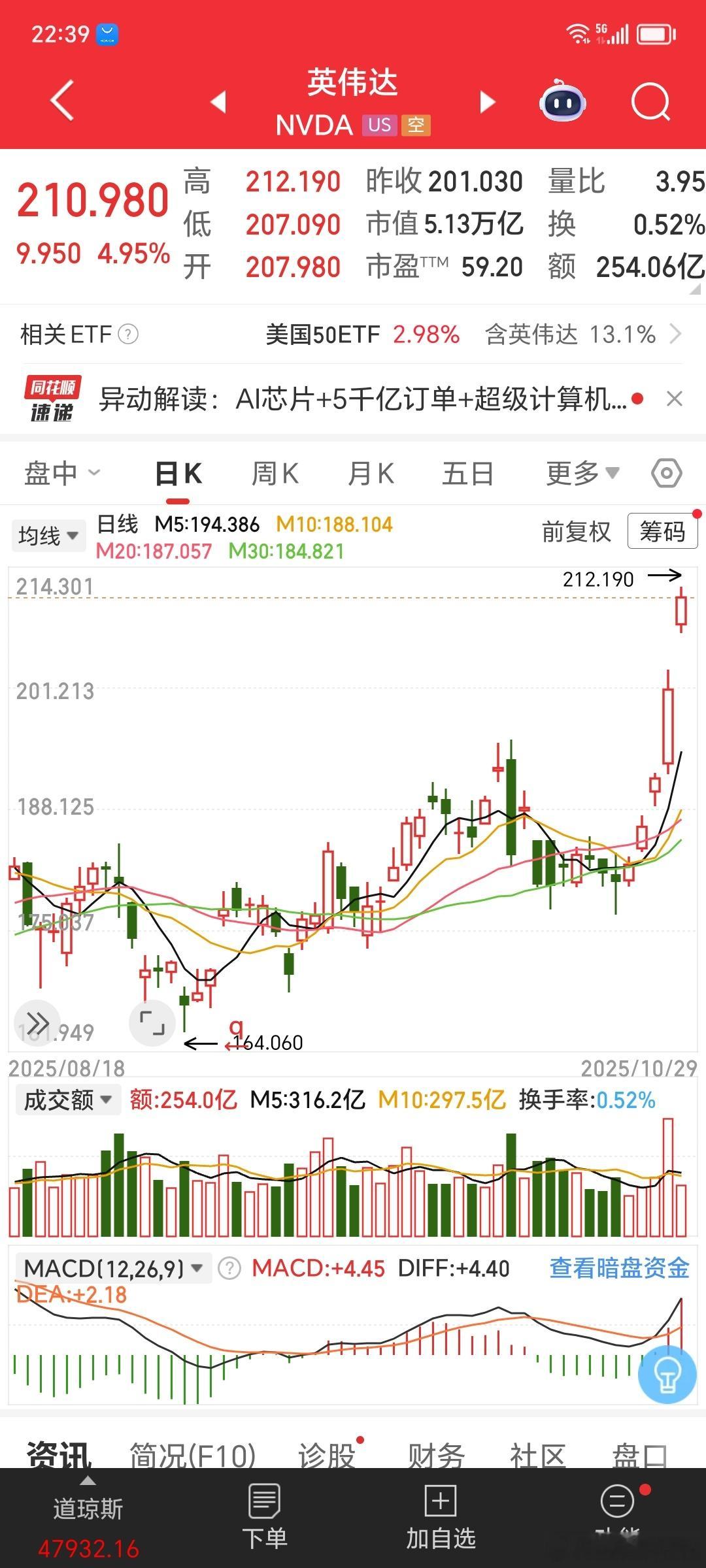 $英伟达NVDA$股价210美元新高,市值破了5万亿美元前三名,微软,英伟达
