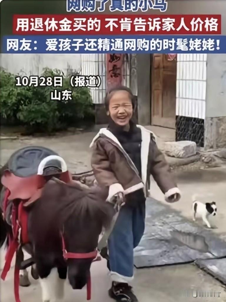 笑不活! 山东姥姥网购“活快递”,花5万买小矮马,背后原因都哭了! 谁能想到啊!取快递取到活物是什么体验?山东一位女婿直接被丈母娘上了一课! 姥姥不会网购,缠着女婿手把手教,本以为只是学个如何付款,结果老太太闷声干大事。花五六万给外孙女买了匹小矮马!女婿接到取件去提货,当场看傻眼,这包裹居然是小马,当场就懵了! 夫妻俩又气又无奈,五六万可不是小数目,但看着女儿抱着小马又蹦又跳的样子,又觉得挺值。 说实话,老一辈的爱就是这么无私,他们不懂什么教育方式,却把孩子随口的喜欢记在心里。 姥姥知道外孙女喜欢,就愿意倾其所有。这份纯粹又厚重的爱,真的是花钱都买不来的啊!