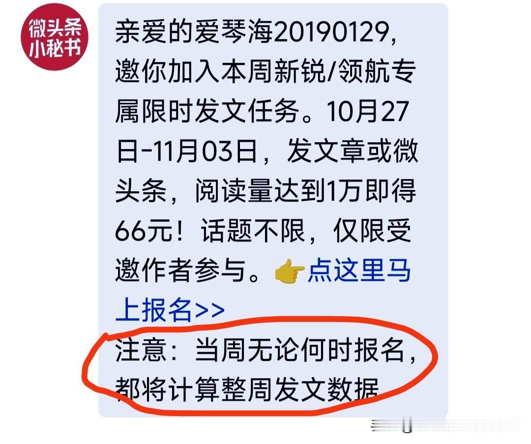 亲爱的头条小秘书又来信息啦,邀我加入本周新锐/领航专属限时发文任务。这是第二次邀请我了,上次就得过一次66元的奖励,对于收益微薄的创作来说,这个66元算是不小的奖励啦。 这个发文任务还有一个好处,就是超自在、话题不限,想写啥就写啥,对于我来说最合适不过啦。 友友们,快看看你们的私信,收到邀请了没有?收到后就抓紧报名吧,不收任何报名费的哦!