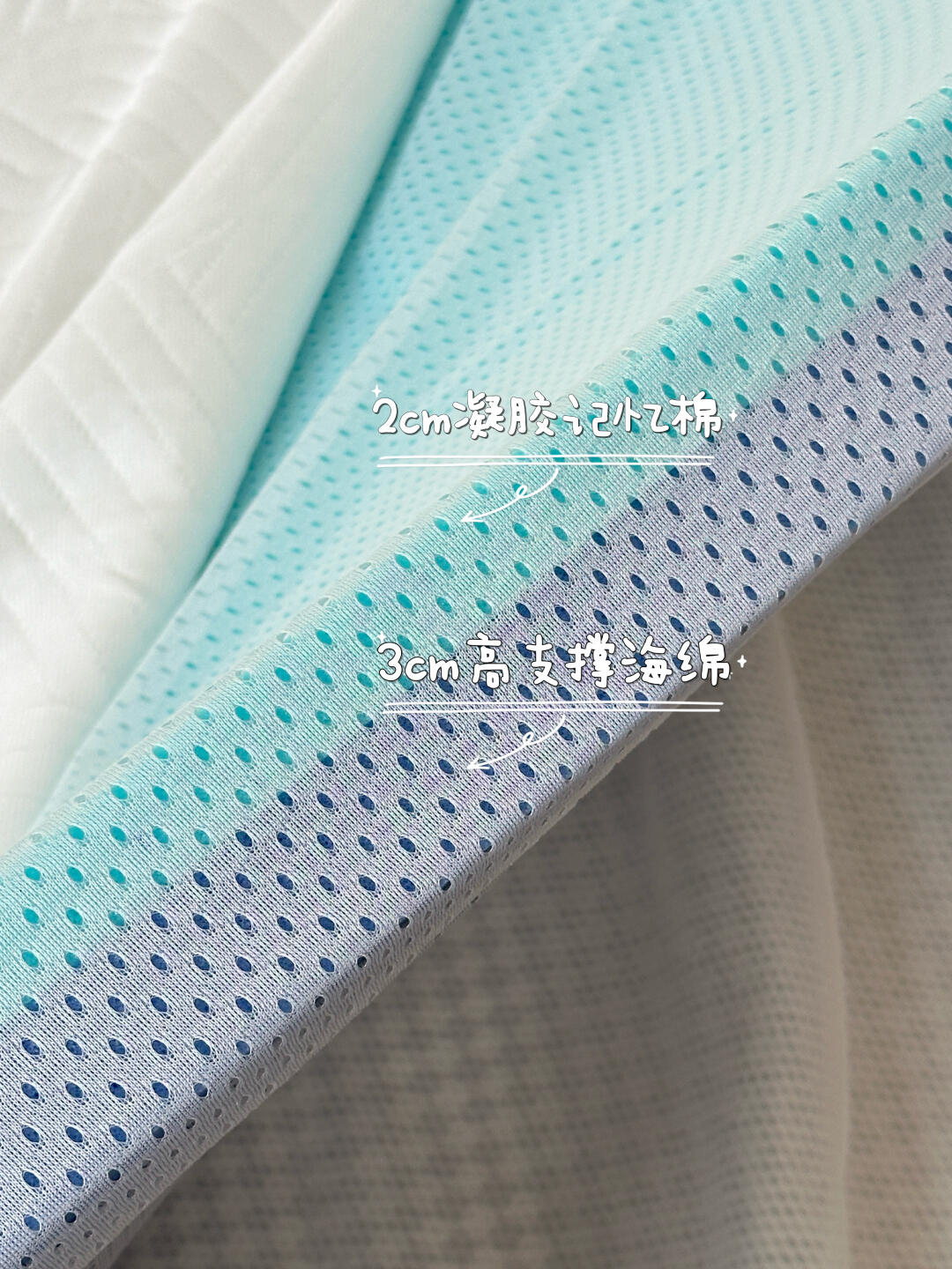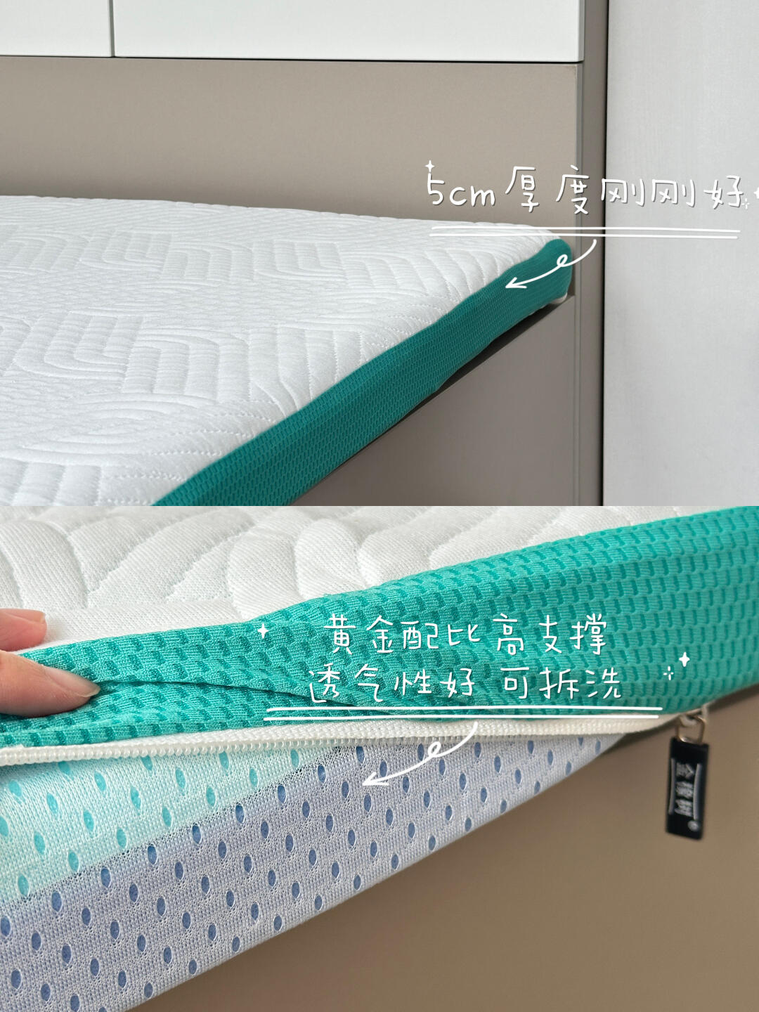 拉链拉开可以看到里面的床垫结构,上层2cm是凝胶记忆棉,躺在上面正好能贴合身体曲线,感觉全身接触面都被包裹了,下层还有3cm的支撑海绵,能提供稳稳的支撑;整体透气性很好,炎热🥵夏天睡觉也不会被闷出汗,去年夏天后背老冒痘,把凉席洗了又洗,没想到居然是床垫的问题……
