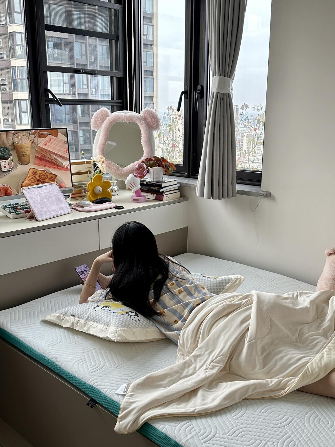 床垫是最近新换的金橡树的反卷垫,之前的床垫因为睡了很久有点发霉了,所以换了一张新床垫,卷包的设计单手也可以扛走,打开包装就自动会复原,床垫侧面是有拉链的,可以把这个抑菌外套拆下来清洗,不用担心女生生理期弄脏床垫了,也很适合住寝室的学生党🧑🎓,好搬运好拆洗