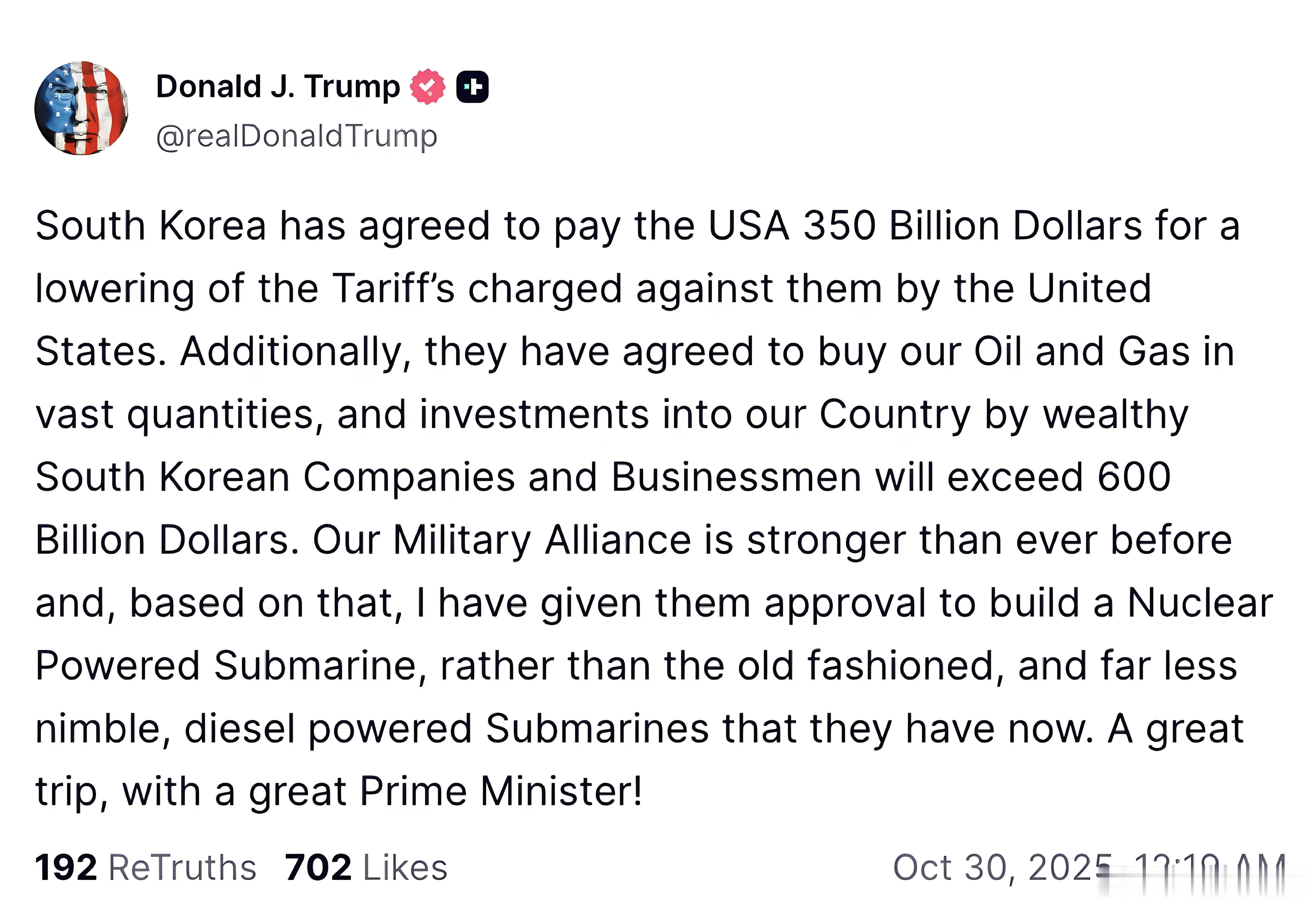 川普:韩国已同意向美国支付 3500 亿美元,以换取美国降低对韩国征收的关税。