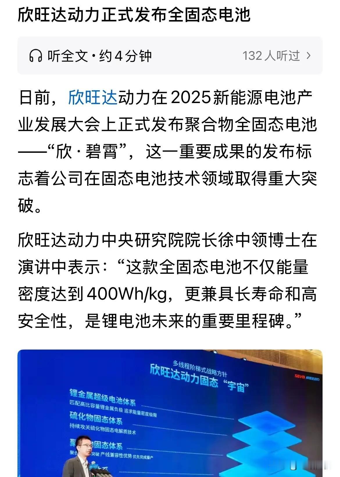 欣旺达正式发布了固态电池, 新能源汽车的电池改革要来了吗? 燃油车将退出历史舞台。 先说说这电池有多“神”,欣旺达这次发布的“欣-碧霄”固态电池,能量密度直接干到400Wh/kg,实验室里甚至测出了520Wh/kg的样品。要知道现在主流的三元锂电池才250Wh/kg左右,这意味着以后电动车续航轻松破1000公里不是梦。更关键的是安全,固态电池用固态电解质替代了易燃易爆的液态电解液,就算被穿刺、挤压也不会起火,-40℃到80℃的极端环境都能正常工作,冬天续航腰斩、充电焦虑这些痛点好像都能解决了。 但先别忙着喊“燃油车再见”,行业内早有共识:固态电池想真正装车应用,至少还得等5年。为啥这么说?核心卡在三个坎上。 首先是量产难度大。现在欣旺达年底才要建0.2GWh的中试线,离大规模生产差远了。固态电解质的涂布均匀性、固液界面阻抗这些问题,实验室里能解决,但量产时良品率还不足60%,成本直接飙上去了。就拿电解质材料来说,固态用的LLZTO粉体价格是液态电解液的10倍,现在预估成本比锂电池高50%,车企和消费者都扛不住。 其次是技术路线还没定型。有的企业走半固态过渡路线,有的直接攻全固态,光专利就有1300多项,绕都绕不开。连宁德时代给自己的固态电池研发进度都只打4分,说要2027年才能小批量量产,大规模普及还得再等3年。中国汽车工程学会更直接,说全固态电池2030年才有望小规模应用,2035年才可能全球推广。 最后是产业链没跟上。从原材料加工到生产设备,现在的产业链都是为液态锂电池建的,要换固态电池,整条生产线都得改造,这可不是一两年能搞定的事。就像之前半固态电池从试验到交付用了4年,全固态只会更久。 其实欣旺达这次发布,更多是秀技术肌肉,告诉行业“我们没掉队”。毕竟比亚迪、丰田这些巨头都在抢固态电池赛道,谁先突破谁就有话语权。但对咱们普通消费者来说,短期内还是得看现有技术,比如比亚迪的刀片电池、宁德时代的麒麟电池,这些才是当下能买到的、性价比高的选择。 所以别被“电池革命”的消息冲昏头,燃油车短期内不会退出,固态电池的美好未来还得慢慢等。不过有一说一,看着技术一步步突破,以后开车再也不用怕续航和安全问题,还是挺让人期待的。