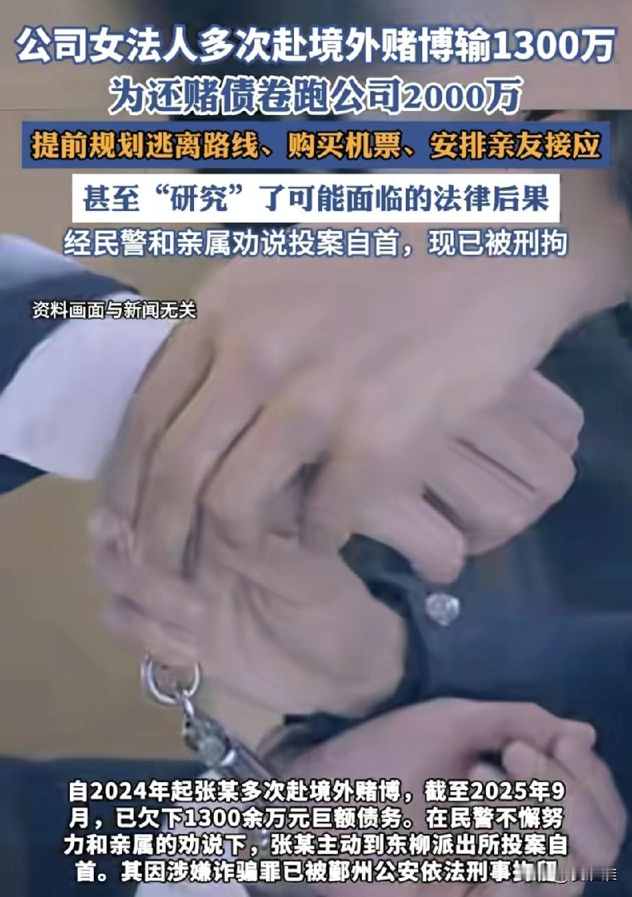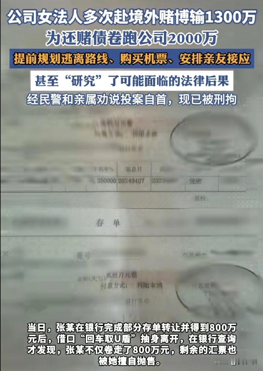 “赌博毁一生!”女子赴境外赌博输掉1300万,每天被债务逼得焦头烂额,恰巧她担任法定代表人的公司进行法人变更,而她名下代持的2000万元存款需要交接给新法人,交接当天,女子在银行拿到800万元后借机溜走,并且将剩余汇票抛售,随后直奔机场,准备跑路。在奔赴机场的过程中,她把部分赃款用于还了赌债,因为害怕被抓,买完机票后却放弃了登机返回家中,躲了起来。公司发现钱款被卷走以后迅速报警,最终,女子在走投无路的情况下,选择了自首,目前,她因涉嫌诈骗罪被刑事拘留! 我想说:从古至今赌博都是一条不归路,毁了太多的人和家庭!